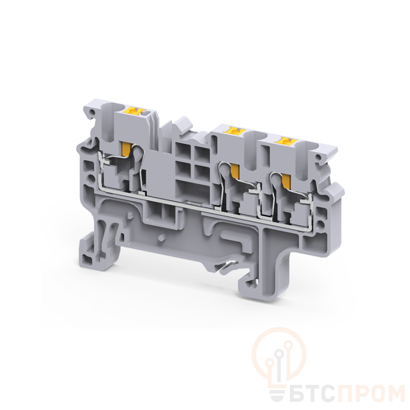 Клемма проходная типа push-in с тремя выводами на номинальное сечение проводника 2,5 кв. мм. Предназначена для установки в распределительных шкафах и щитах систем автоматического управления (САУ) с монтажом на DIN-рейки. Клеммы позволяют легко присоединить круглые медные проводники, номинальным сечением 2,5 кв.мм, обеспечивая надежный контакт и простоту сборки электрических схем. Особенностью данного типа клемм является возможность подключения трёх проводников в одной клемме, обеспечивая большую плотность подключений и компактность решения. Все клеммные зажимы в одной клемме имеют электрическую связь. Клеммы применяются в электрических цепях на номинальное напряжение до 1000 В переменного тока.
