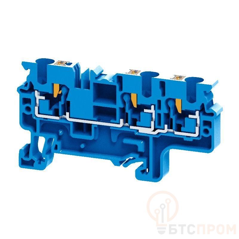 Клемма проходная типа push-in с тремя выводами на номинальное сечение проводника 4 кв. мм. Предназначена для установки в распределительных шкафах и щитах систем автоматического управления (САУ) с монтажом на DIN-рейки. Клеммы позволяют легко присоединить круглые медные проводники, номинальным сечением 4 кв.мм, обеспечивая надежный контакт и простоту сборки электрических схем. Особенностью данного типа клемм является возможность подключения трёх проводников в одной клемме, обеспечивая большую плотность подключений и компактность решения. Все клеммные зажимы в одной клемме имеют электрическую связь. Клеммы применяются в электрических цепях на номинальное напряжение до 1000 В переменного тока.