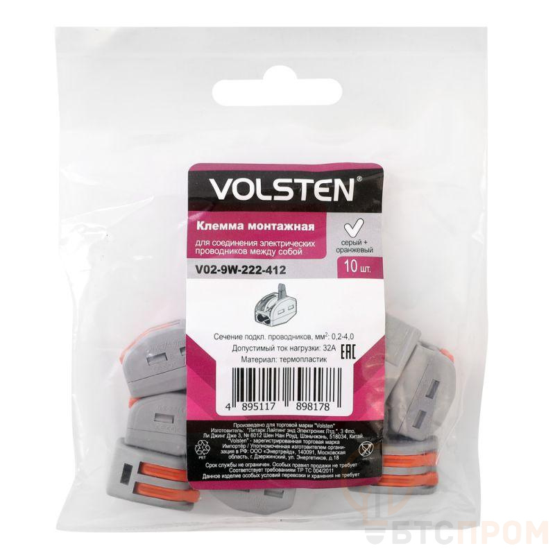 –Клемма строительно-монтажная СМК 2 пр. до 4мм 32А 450 В 10шт V02-9W-222-412 сер. Volsten 15218