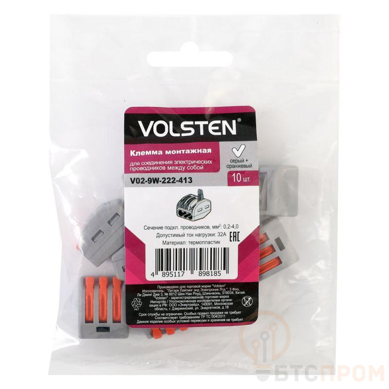 Клемма строительно-монтажная СМК 3 пр. до 4мм 32А 450 В 10шт V02-9W-222-413 сер. Volsten 15220 фото в каталоге от BTSprom.by