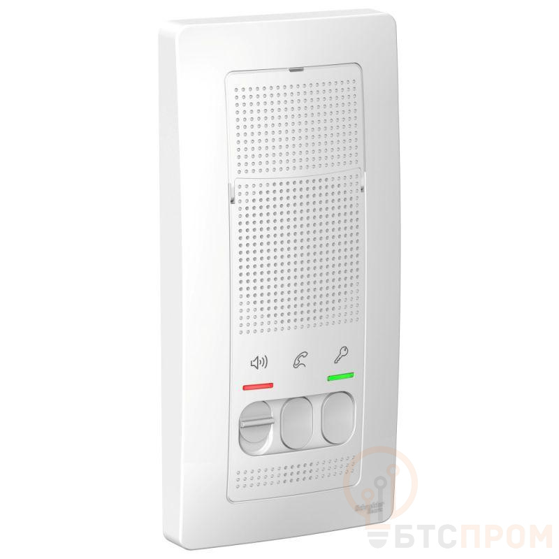 Устройство Systeme Electric (ранее Schneider Electric) BLANCA (цвет – белый) переговорное настенного монтажа предназначено для домофонных систем, питается от батарейки (3 элемента питания ААА х 1,5В). Громкость устройства регулируется, нанесены символы «Звук» и «Разговор». Размеры устройства: 187*84*25 мм. Корпус изделия выполнен из ABS-пластика.