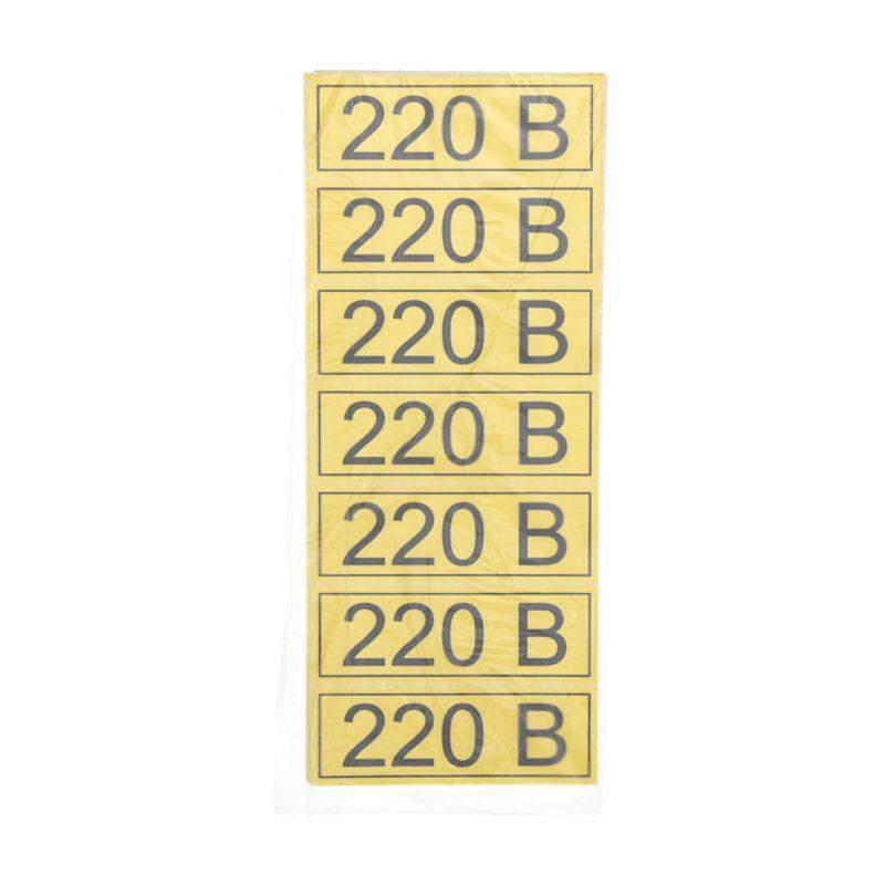 Знак электробезопасности (наклейка) «220 В» – это информационный знак, который сообщает о напряжении в электрической сети. Предназначен для размещения около розеток и выключателей. Наклейка используется для предупреждения и информирования окружающих, а также для организации мест работы электромонтажных бригад. Наносится на ровную сухую поверхность. Знак выполнен из прочного износостойкого материала, благодаря чему устойчив к воздействию прямых солнечных лучей, перепадам температур и мелким механическим воздействиям. Знак хорошо виден на любой поверхности, легко клеится, крепко держится и не оставляет следов после снятия. Комплект набора: 70 наклеек размером 35х100 мм (10 листов, по 7 наклеек на каждом).