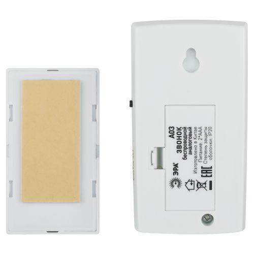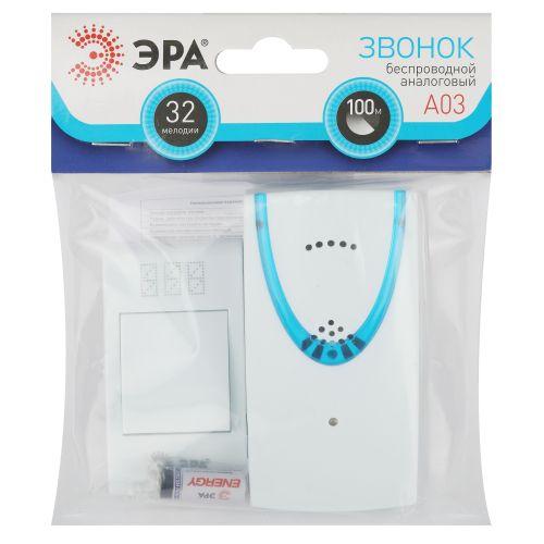 ЭРА А03 - беспроводной аналоговый дверной звонок универсального дизайна в легком прочном корпусе базового белого цвета. Доступны 32 полифонические мелодии, их можно менять под настроение - звонок никогда не надоест. Работает от 3 мизинчиковых батареек (3 х ААА). Простой и лаконичный корпус звонка в белом цвете смотрится элегантно. Не нужно подключение к электросети, быстро монтируется в любое удобное место. Радиус действия - 100 метров. Этот звонок от компании ЭРА будет служить Вам долго!