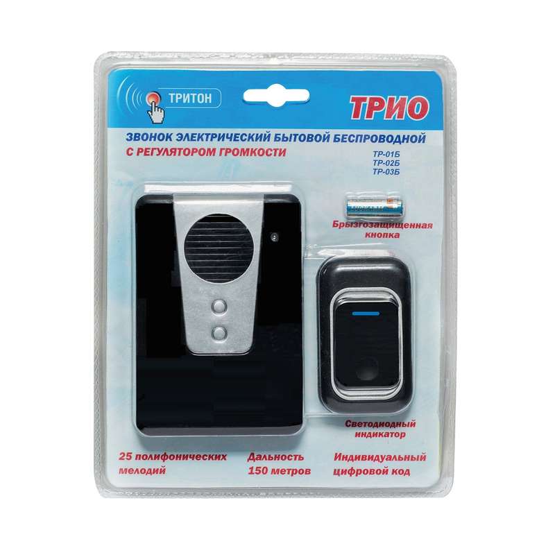 Звонок беспроводной полиф. Трио 32 мел. 150м 4-тон. полифония регул. громкости настол.-настен. брызгозащ. кнопка IP44 3ААх1.5В Тритон ТР-02Б