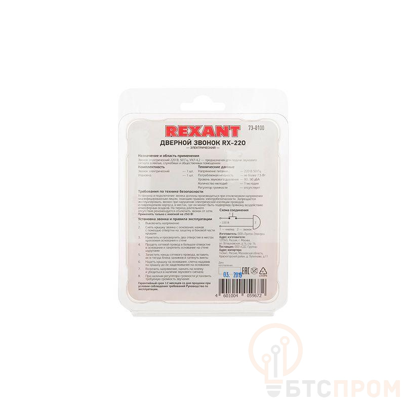 Проводной электрический звонок предназначен для подачи звукового сигнала в жилых, служебных и общественных помещениях. Корпус устройства выполнен из прочного АБС-пластика, который обеспечивает надежность и долговечность в эксплуатации. Звонок подключается к электрической сети напряжением 220 В посредством проводного соединения. Звуковой сигнал представлен одной мелодией в виде электронной трели. Устройство предназначено для установки исключительно в сухих помещениях, что необходимо учитывать при выборе места монтажа. Кнопка звонка приобретается отдельно и должна соответствовать требованиям совместимости с данным устройством.