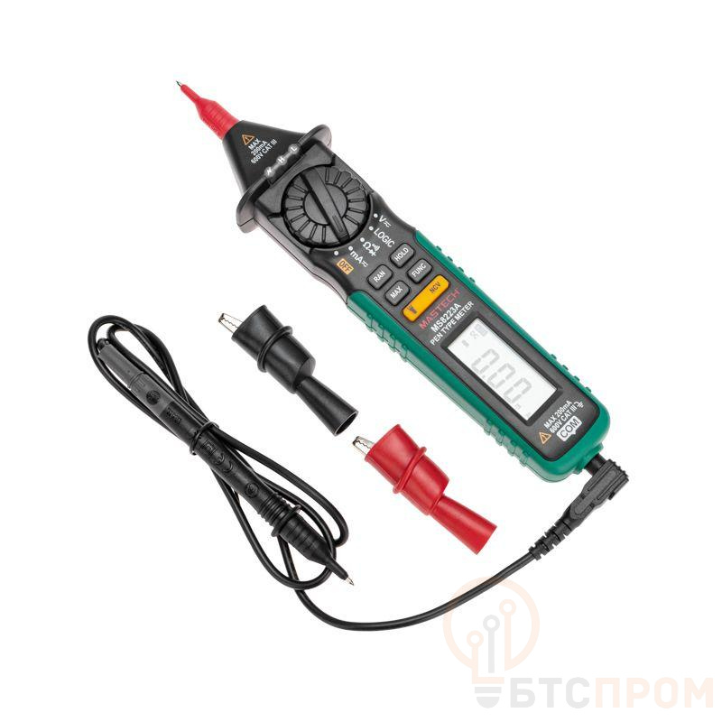 Цифровой мультиметр MASTECH MS8223A – прибор 2 в 1 – тестер напряжения и мультиметр, позволяющий измерять постоянное и переменное напряжение, сопротивление. Продолжение серии 8211. Имеет режим «прозвонка», диод-тест. Особенность этого мультиметра заключается в наличии бесконтактного датчика напряжения (NCВ) с регулировкой чувствительности. Мультиметр имеет звуковую и световую индикацию. Модель работает от 2 батареек 1.5 В ААА. Технические характеристики: Бесконтактный датчик напряжения (NCВ) Измерение логических уровней Автоматический и ручной выбор пределов измерения Разрядность шкалы дисплея: 2000 отсчетов Постоянное напряжение: 0,1 мВ - 600 В (±0,7% ±2) Переменное напряжение: 0,1 мВ - 600 В (±0,8% ±3) Постоянный ток: 0,01 мА - 200 мА (±1,5% ±3) Переменный ток: 0,01 мА - 200 мА (±2% ±3) Сопротивление: 0,1 Ом - 20 МОм (±1% ±1) Звуковая прозвонка: сигнал звучит при сопротивлении менее ~60 Ом Тест диодов Подсветка дисплея и подсветка рабочей области Фиксация показаний дисплея (HOLD) Фиксация максимального показания (MAX) Входной импеданс: ~ 10 МОм Автоотключение питания: 15 минут отсутствия активности Индикация перегрузки: символ «OL» на ЖК-дисплее Индикатор разряда батарей Время измерения: ~0,4 сек Максимальное допустимое напряжение: 600 В CAT III Рабочая температура: 0…+40 °С Температура хранения: -10…+50 °С Защита гнезда mA: быстрый предохранитель 400 мA/600 В Питание: батареи 2 шт. х 1,5 В тип ААА Комплект поставки: прибор, батареи, измерительный щуп, крокодилы, мягкий чехол, инструкция по эксплуатации Размеры: 222х43х29 мм Масса: 129 г Масса с упаковкой: 310 г