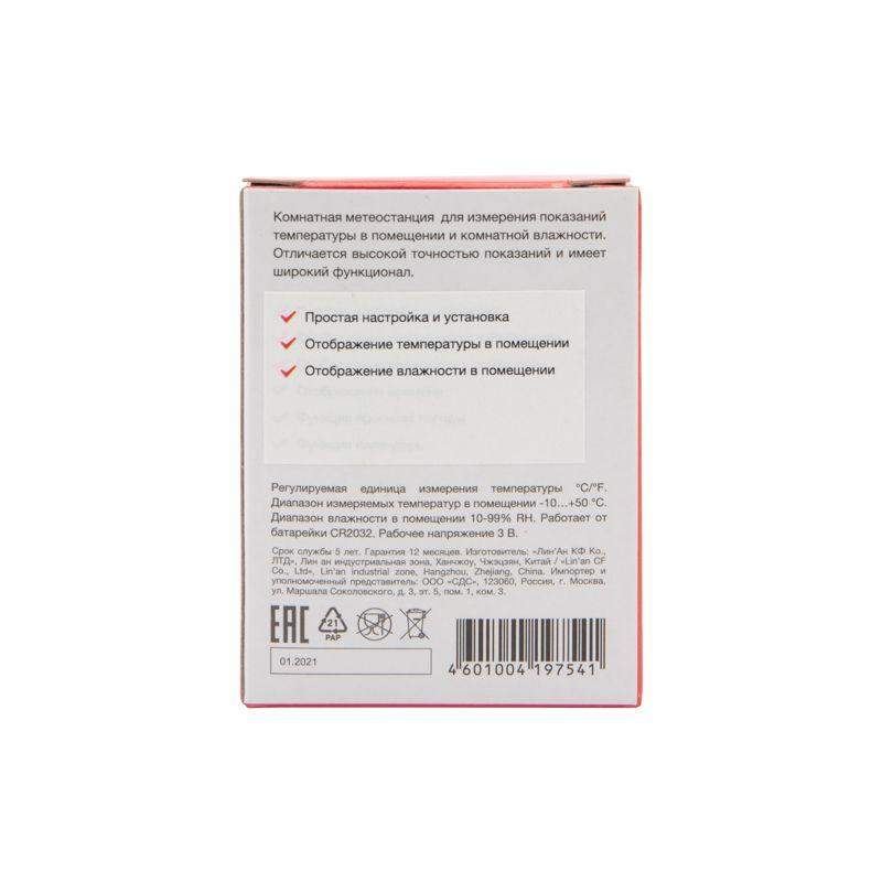 Комнатная метеостанция S5023 REXANT предназначена для измерения температуры и влажности в помещении. Станция регистрирует в памяти максимальное и минимальное значения температуры и влажности, а также отображает общий уровень метеокомфорта в помещении. Широкий функционал устройства делает его оптимальным для использования в домашних условиях, в офисе, а также в учебных и медицинских учреждениях. В комплект поставки входят метеостанция (1 шт.), подставка (1 шт.), наклейка 3М (1 шт.), батарейка CR2032 на 3 B (1 шт.), упаковка, руководство по эксплуатации.