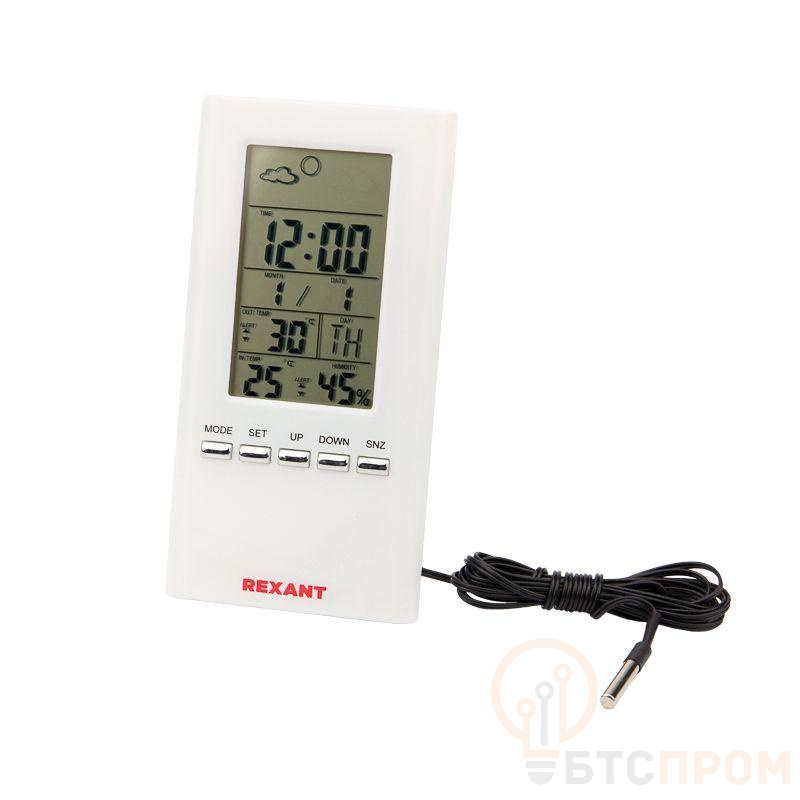 Комнатно-уличная метеостанция REXANT предназначена для измерения температуры в помещении и на улице, а также для измерения влажности в комнате. Широкий функционал устройства делает его оптимальным для использования в домашних условиях, в офисе, а также в учебных и медицинских учреждениях. Изделие оснащено часами(12ч/24ч), календарем, будильником, а также функцией отображения прогноза погоды (солнечно, солнечно и облачно, пасмурно, дождливо). Прибор регистрирует в памяти максимальное и минимальное значения температуры. Для удобства использования температура может отображаться в градусах Цельсия или в градусах Фаренгейта (°C/°F).