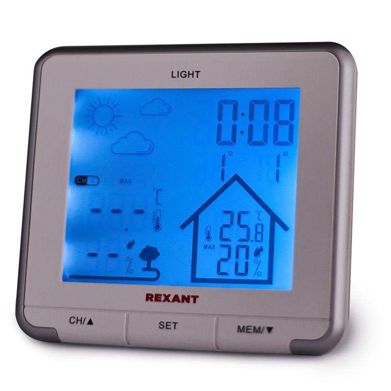 Беспроводная метеостанция с ЖК-экраном и сенсорной кнопкой REXANT предназначена для измерения температуры и влажности как внутри, так и снаружи помещений. Широкий функционал делает устройство оптимальным для использования в домашних условиях, в офисе, а также в учебных и медицинских учреждениях. Станция регистрирует максимальное и минимальное значения температуры. Также прибор имеет функцию отображения времени, календаря и прогноза погоды. К метеостанции можно подключить до трех наружных датчиков. Изделие оснащено детектором разряда батареи. Благодаря компактным размерам 18,3х2,5х12,5 см метеостанция не занимает много места. Источник питания: 3 батарейки ААА в метеостанцию, 2 батарейки формата ААА для беспроводного датчика. Батарейки не входят в комплект поставки.