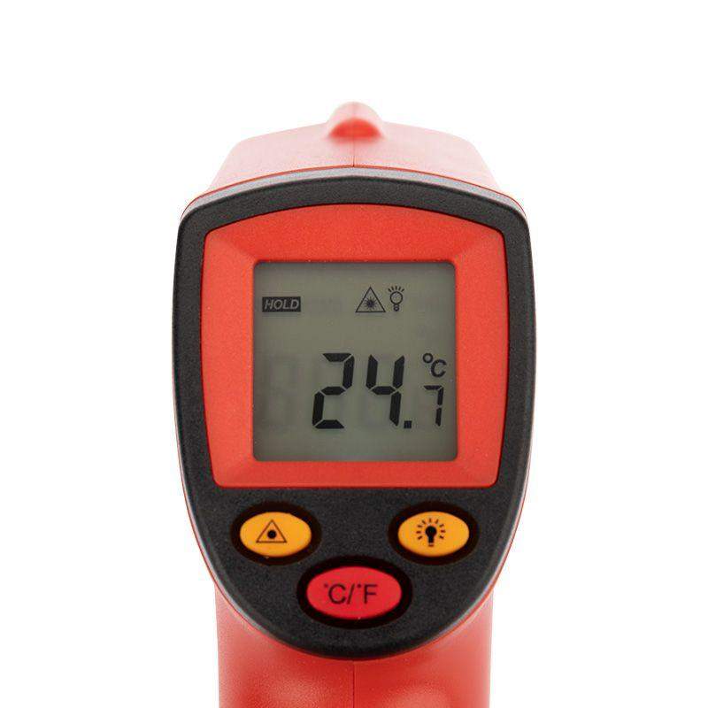 Пирометр REXANT R-400 — это прибор, предназначенный для бесконтактного дистанционного измерения температуры различных объектов. Принцип действия построен на измерении уровня теплового излучения объекта в диапазонах инфракрасного излучения. Пирометры применяются в сферах ЖКХ, промышленности, на предприятиях, в бытовых целях и везде, где большое значение приобретает контроль температур. Приборы такого типа необходимы в роли средств безопасности и контроля температурных норм в различных технологических и производственных сферах, так как физическое взаимодействие с объектом измерения не нужно и полностью отсутствует возможность получения ожога или других связанных с большими температурами травм. Такие приборы не подходят для измерения температуры людей, для этого применяются подобные пирометры, но с узким диапазоном выборки температур (от 32 до 42 градусов). R-400 — прибор для дистанционного определения температуры объектов пистолетного типа, выполнен из высококачественного пластика. Данный пирометр компактный и качественный, его легко держать и управлять им одной рукой. Оснащен энергосберегающим дисплеем с подсветкой, что позволяет проводить измерения в слабоосвещенных местах или темное время суток. При неиспользовании в течение 7 секунд, выключается сам и запускается мгновенно при нажатии на курок. Имеет лазерный прицел, что позволяет проводить более точные измерения именно тех объектов или областей на объекте, которые необходимо проверить. На управляющей панели есть возможность выбора температурной шкалы (Цельсия, Фаренгейта), кнопки включения и выключения лазерного прицела и подсветки. Калибровка и тестирование приборов произведены под контролем компании СДС. Особенности: Подсветка дисплея Время измерения температуры: 0,5 сек Переключение между диапазонами измерения в Цельсиях и Фаренгейтах Включение/выключение лазерного прицела Низковольтная система питания с энергосберегающими функциями Функция автоотключения при бездействии: через 7 секунд Простое питание от 2 батареек или аккумуляторов стандарта ААА (2 шт в комплекте) Характеристики: Диапазон измерений: –50~ 330 °С/-58~626 °F Погрешность: 0~330 °С (–58~626 °F) ±1.5°С (±2.7 °F) или ±1.5% -50~0 °С (-58~32 °F) ±3 °С (±5 °F) но не менее Цена деления: 0.1 °C Оптическое разрешение (отношение расстояния к размеру пятна): 12:1 Коэффициент оптического излучения: постоянный, 0.95 Соотношение расстояния до объекта к диаметру области измерения 12:1 Рабочие температуры, 0...+40 °С Лазерный целеуказатель Laser Class II <1mW Источник питания: батареи 1.5 В, тип ААА 2 шт. Вес: 120 г (с батареями) Размеры:153 x 38 x 85 мм