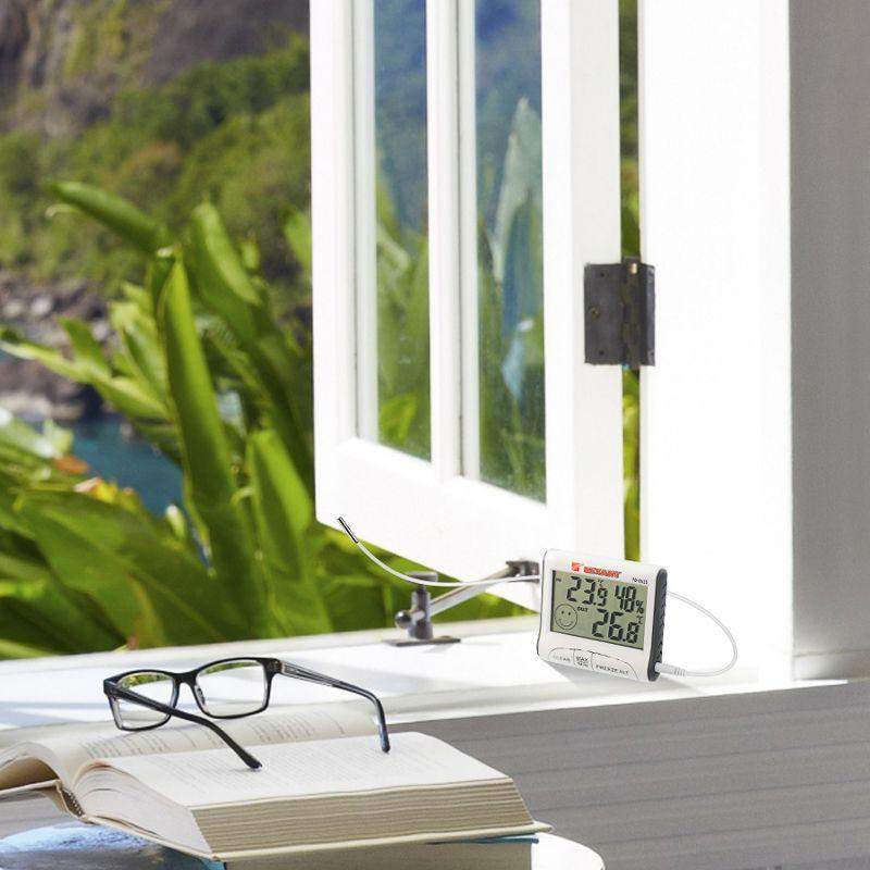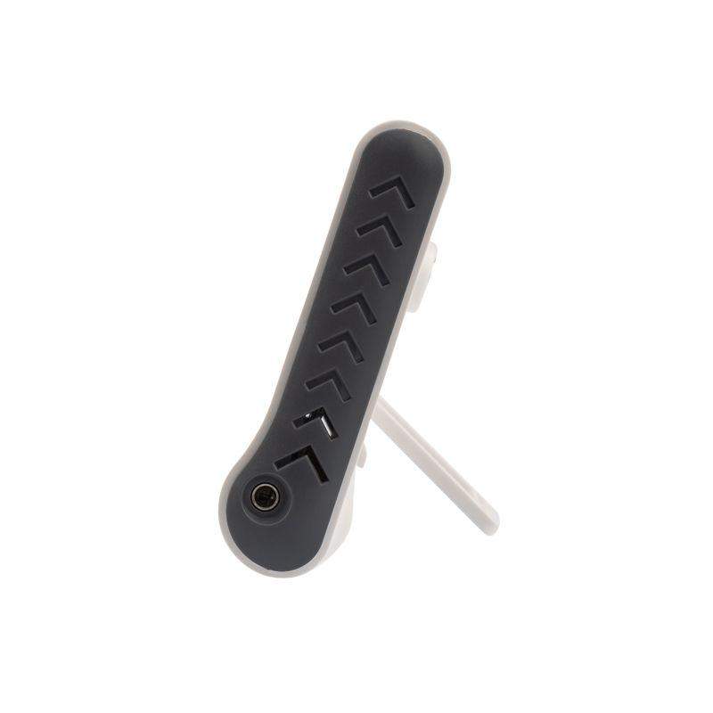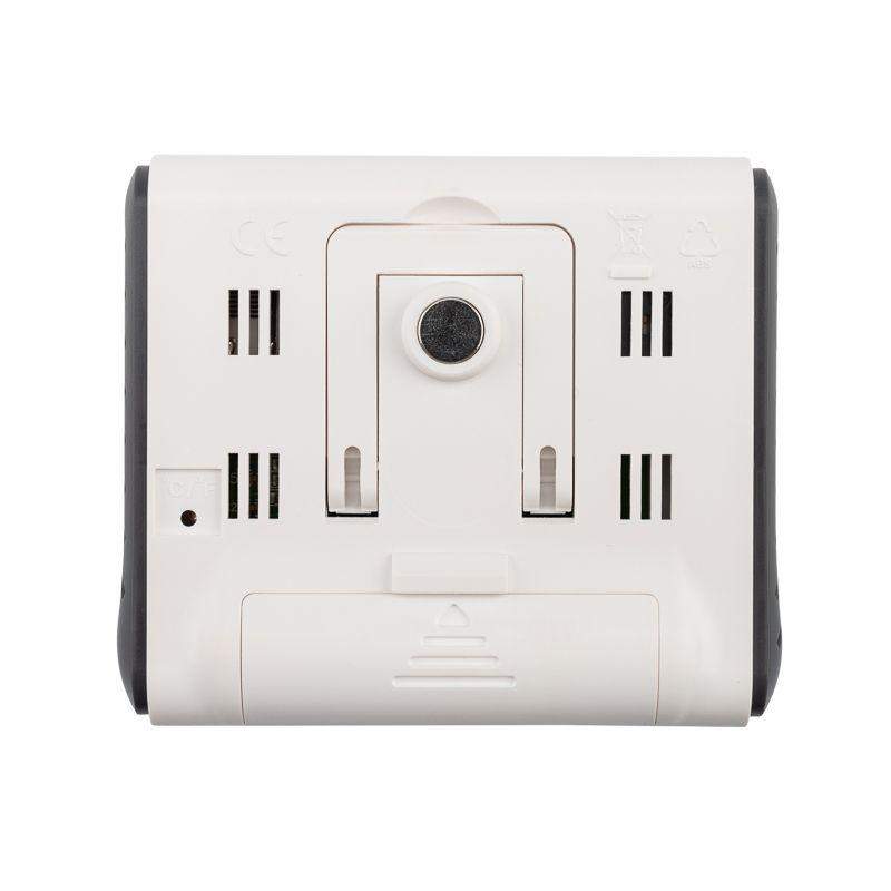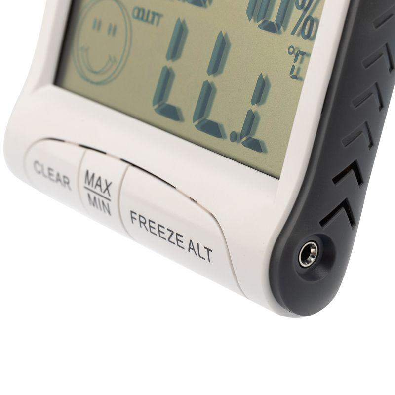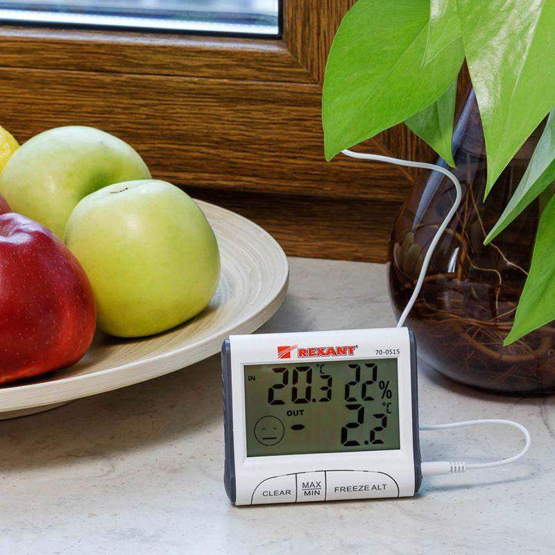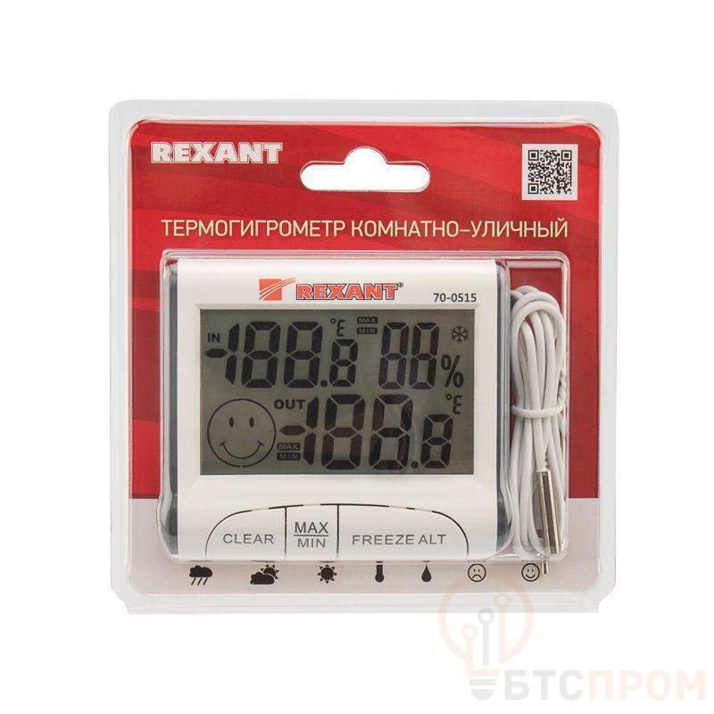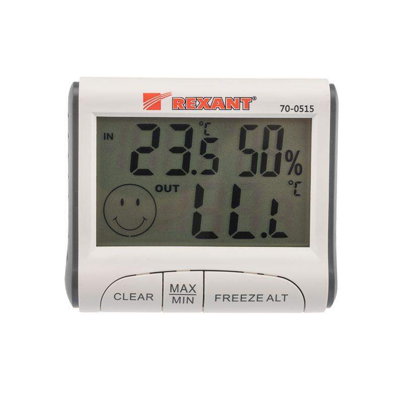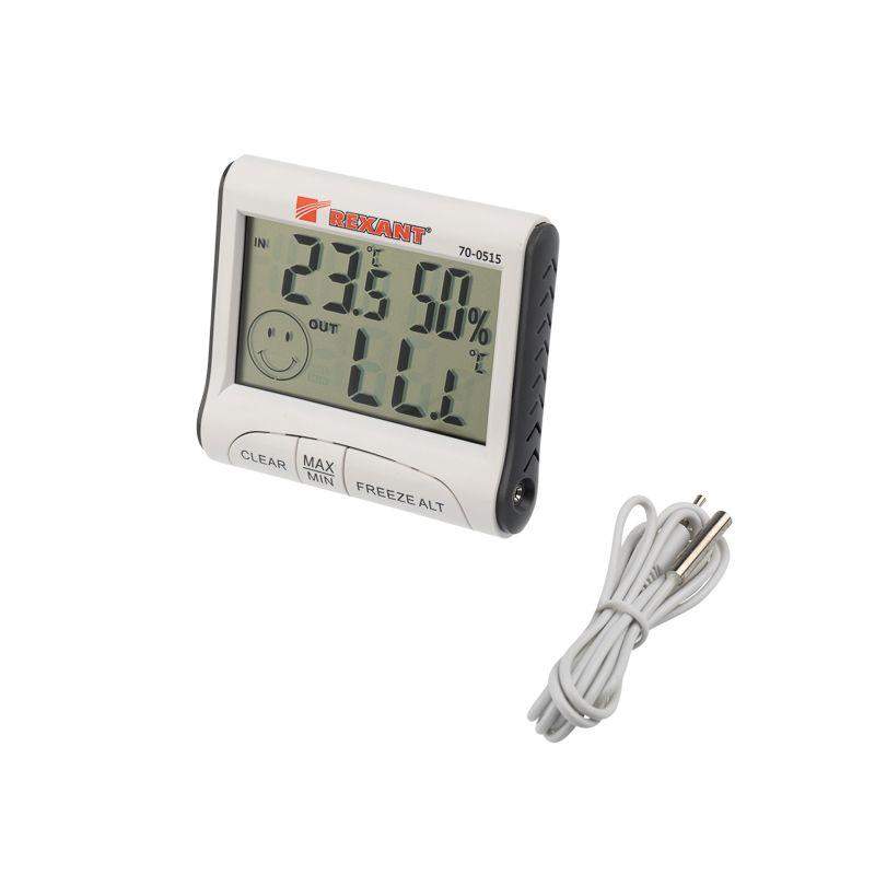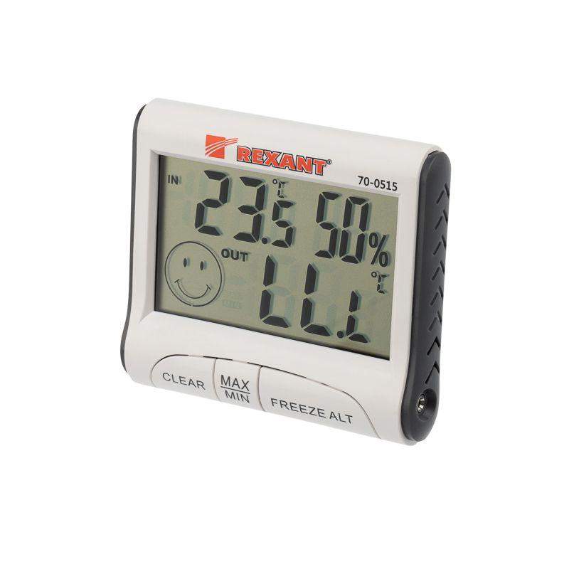 Комнатно-уличный термогигрометр с проводным выносным датчиком REXANT предназначен для измерения показаний температуры внутри и снаружи помещений, а также для измерения влажности в комнате. Термогигрометр регистрирует в памяти максимальное и минимальное значения температуры, а также отображает общий уровень метеокомфорта в помещении. Для удобства использования температура может отображаться в градусах Цельсия или в градусах Фаренгейта (°C/°F). На передней части корпуса расположены 3 большие кнопки управления и настройки. Сбоку находится разъем для подключения выносного датчика. Благодаря подставке, термогигрометр будет удобно разместить в любом месте. Корпус выполнен из гипоаллергенного качественного ABS-пластика. Длина провода выносного датчика составляет 1 м.