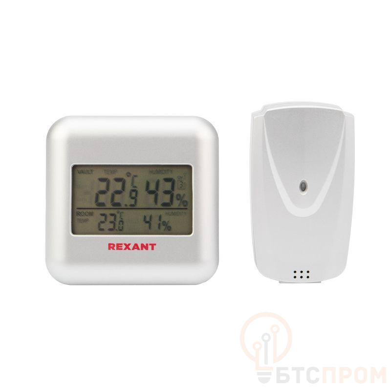 Электронный термометр с беспроводным выносным датчиком REXANT предназначен для измерения температуры и влажности внутри и снаружи помещений. Широкий функционал делает устройство оптимальным для использования в домашних условиях, в офисе, а также в учебных и медицинских учреждениях. Станция регистрирует максимальное и минимальное значения температуры. Также прибор оснащен часами и будильником. К метеостанции можно подключить до трех наружных датчиков. Источник питания: 4 батарейки ААА: 2 шт. для электронного термометра, 2 шт. для беспроводного датчика. Батарейки не входят в комплект поставки.
