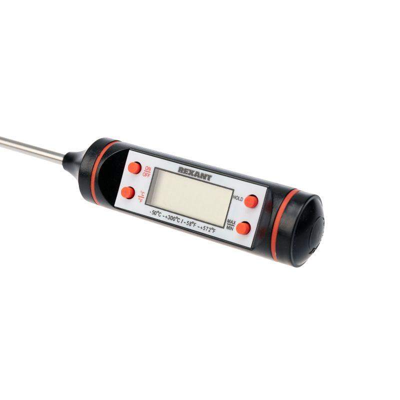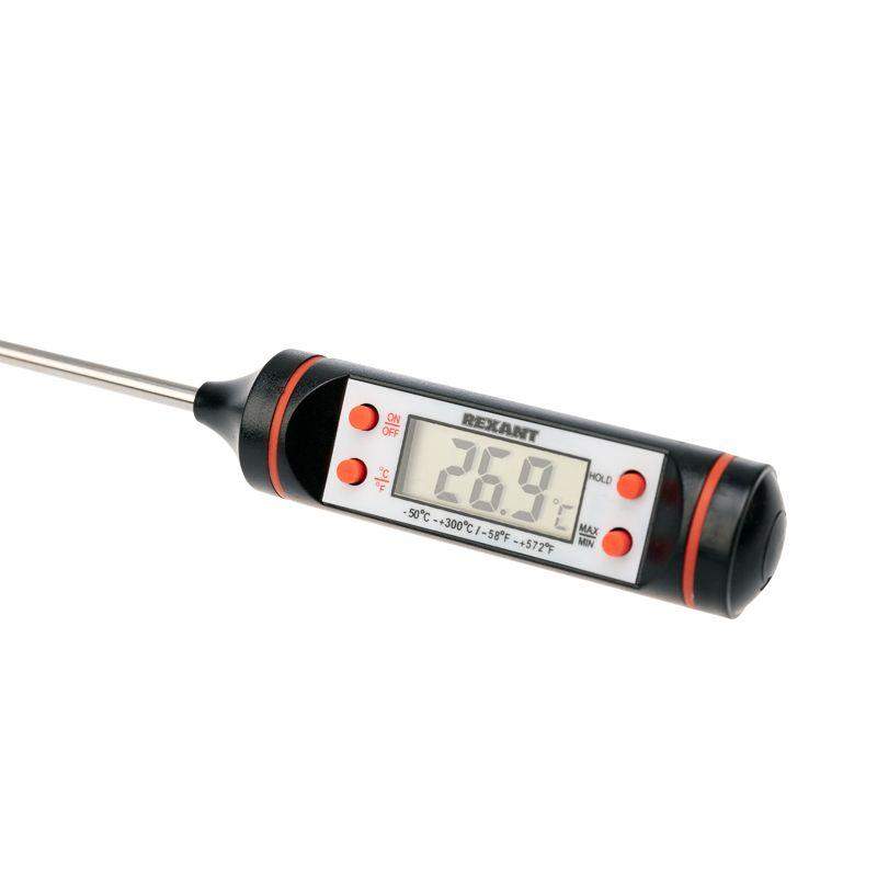 Цифровой термометр (термощуп) предназначен для измерения температуры продуктов и жидкостей. Применяется на фабриках, в ресторанах, лабораториях и в домашнем хозяйстве. Цифровой термометр отличается низким потреблением энергии, высокой стабильностью работы, высокой точностью, компактностью и простотой в использовании. Термощуп оптимально подходит для измерения температуры напитков, молока, кофе и других продуктов. Диапазон измеряемых температур составляет от -50 до +300 °C. Размер – 245х22 мм.