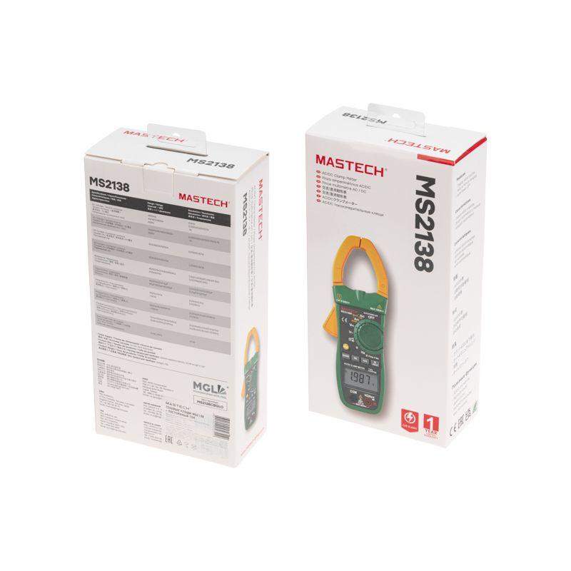 Токовые клещи MASTECH MS2138 позволяют измерять бесконтактным способом силу тока, а также с помощью щупов измерять величину напряжения, сопротивления и частоту. Прибор полностью соответствует стандартам электробезопасности. В токовых клещах MASTECH MS2138 предусмотрена подсветка дисплея для читаемости полученных результатов в условиях недостаточной видимости, а также подсветка раскрыва клещей для видимости объекта измерений. С помощью кнопки DATA HOLD можно зафиксировать последний полученный результат. Прибор автоматически отключится в случае длительного простоя. В токовых клещах MASTECH MS2138 предусмотрена также функции проверки диодов и прозвонка электрической цепи на качество соединения. Характеристики: Разрядность шкалы дисплея: 4000 отсчетов Бесконтактное измерение частоты тока в клещах: 0,01 Гц…~1 кГц, погрешность ±1,5% ±5 единиц счета Автоматический выбор пределов измерений Возможность ручного выбора предела измерений Переменный ток: 0,01 А…1000 А, погрешность ±2,5% ±6 единиц счета Постоянный ток: 0,01 А…1000 А, погрешность ±3% ±6 единиц счета Переменное напряжение: 1 мВ…600 В, базовая погрешность ±0,8% ±3 единицы счета Постоянное напряжение: 0,1 мВ…600 В, базовая погрешность ±0,7% ±3 единицы счета Сопротивление: 0,1 Ом…40 МОм, базовая погрешность ±0,8% ±3 единицы счета Емкость: 10 пФ...4 000 мкФ, погрешность ±4% ±5 единиц счета Частота: 0,1 Гц...10 МГц, погрешность ±0,5% ±3 единицы счета Скважность импульсов: 10%...90%, погрешность ±3% Звуковая прозвонка: сигнал при сопротивлении менее ~40 Ом Входной импеданс: ~10 МОм Тест диодов: 2,7 В Функция относительных измерений Диаметр раскрыва клещей: 40 мм Автоотключение питания: 30 минут отсутствия активности Частота обновления показаний: 2-3 Гц Фиксация показаний DATA HOLD Подсветка дисплея Фонарик подсветки рабочей области клещей Индикация перегрузки: символ «OL» на ЖК дисплее Индикатор разряда батарей Диапазон рабочих температур: 5...+35 °С Диапазон температур хранения: –10...+50 °С Питание: батареи 3 шт. х 1,5 В тип ААА Комплект поставки: прибор, батареи, измерительные щупы, мягкий чехол, инструкция по эксплуатации Размеры: 225х86х32 мм Масса: 330 г Масса с упаковкой: 620 г