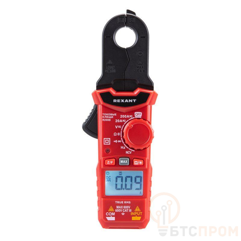Многофункциональные компактные цифровые токовые клещи R200D REXANT– это прибор, который позволяет измерить постоянный и переменный ток до 200A, емкость, частоты и т.д. Среднеквадратичный метод измерения значений (True RMS) гарантирует точные результаты измерений. Выбор пределов измерений – автоматический. Прибор обладает компактными размерами, что упрощает доступ, хранение и транспортировку. Предусмотрена функция установки нуля при работе с постоянным током (DCA ZERO). Параметры измерений: Постоянное напряжение: 200мВ/2В/20В/200В/600В ±(0.5%) Переменное напряжение: 2В/20В/200В/600В ±(1.0%) Постоянный/переменный ток: 20A/200A ±(2.5%) Сопротивление: 200 Ом/2кОм/20кОм/200кОм/2MОм/20MОм ±(1.0%) Емкость: 2нф/20нф/200нф/2мкф/20мкф/200мкф/2мф/20мф ±(4.0%) Частота: 2Гц/20Гц/200Гц/2кГц/20кГц/200кГц/2MГц/20MГц ±(1.0%) Основные функции и особенности: Автоматический выбор пределов измерений Среднеквадратичный метод измерения значений – True RMS Режимы максимальных измерений (MAX) Функция памяти данных DATA HOLD Установка нуля (обнуление значений) в режиме измерения силы постоянного тока (DCA ZERO) Режим «прозвонка», диод- тест Бесконтактный детектор напряжения NCV с индикацией Разрядность дисплея: 2000 отсчетов Раскрытие клещей: 16 мм Количество измерений в секунду: 3 Оранжевая подсветка дисплея при наличии силы тока свыше 1 А Функция подсветки дисплея Автоматическое отключение питания через 15 минут Батарейка: 1,5 В ААА, 2 шт. Вес с батареями: 260 г Габариты: 176х61х31 мм Комплект поставки: токовые клещи, измерительные щупы, батареи, инструкция