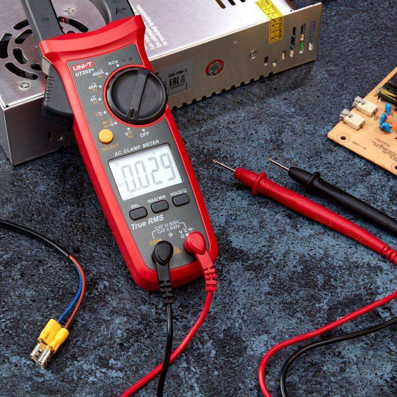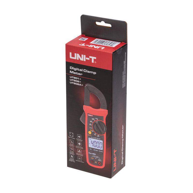Токоизмерительные TRUE RMS цифровые клещи UNI-T UT202+ являются обновлением модели 202. С их помощью измеряется переменный ток, постоянное и переменное напряжение до 600В, сопротивление, емкость и температуру контактным методом. Имеют удобное управление с отображением данных на экране. Оснащены многими функциями, такими как звуковая прозвонка целостности цепи, проверка диодов, а также удержание результатов DATA HOLD для тех случаев, когда измерения проводятся в труднодоступных местах и нет возможности взглянуть на экран. Отличительные особенности: метод измерения истинный среднеквадратичный (True RMS), бесконтактный детектор напряжения NCV, измерение частот напряжения и тока, измерение максимальных/минимальных, относительных значений, подсветка дисплея, индикация разряженной батареи, автоотключение питания (15 мин), автоматический выбор пределов измерений. Клещи имеют удобное управление с отображением данных на экране. Характеристики: Функция бесконтактного определения напряжения (NCV) Тест на падение с высоты 1 метр Метод измерения: истинный среднеквадратичный (True RMS) Емкость: 4нФ/40нФ~400мкФ/4000мкФ ± (4%+5) Температура: -40°С ... ~+1000°С ± (1.5%+5) Режим относительных измерений (REL) Дисплей: 4000 отсчетов Переменный ток: 4A/40A/400A ± (2%+10) Частота измеряемого тока: 50Гц~100Гц ± (1%+5) Переменное напряжение: 4В/40В/400В/600В ± (0.8%+5) Частота измеряемого напряжения: 10 Гц ~10 кГц ± (1%+5) Постоянное напряжение: 4В/40В/400В/600В ± (0.5%+2) Сопротивление: 400Ом/4кОм/40кОм/400кОм/4MОм/40MОм ± (0.8%+2) Диаметр раскрытия клещей: 28 мм Индикация разряженной батареи Индикация перегрузки: символ «OL» на дисплее Дисплей: 37 х 25 мм Питание: батареи 2 шт. х 1,5 В тип AAА Размеры: 215 х 63 х 36 мм Масса: 250 г Комплект поставки: прибор, батареи, измерительные щупы, термопара, чехол, инструкция по эксплуатации