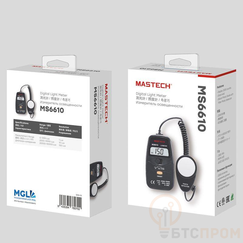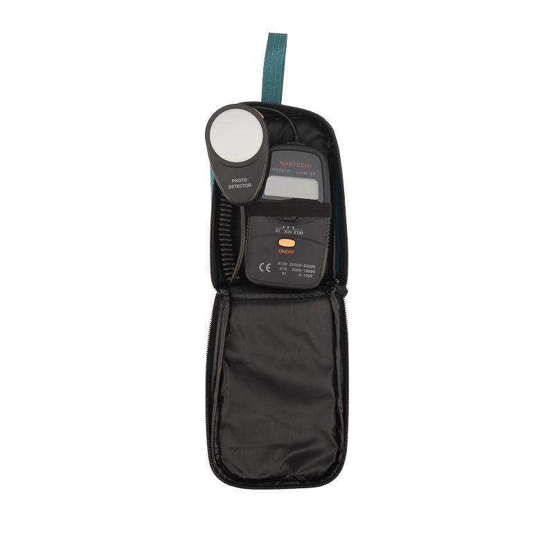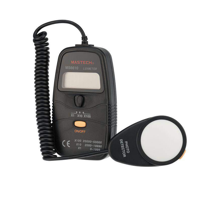 Люксметр MASTECH MS6610 предназначен для измерения освещенности в диапазоне от 0 до 50000 лк. Фотометр состоит из датчика освещенности (фотодетектора) и счетного устройства. Характеристики: Диапазон: 0~50000 лк Функция DATA HOLD (удержание данных) Индикатор низкого заряда батареи Дисплей 1999, ЖК дисплей Диапазон 0 ~ 2000 лк (1 Люкс) ±5,0%, 2000 ~ 19990 лк (10 Люкс) ±5,0%, 20000 ~ 50000 лк (100 Люкс) ±5,0% Питание: 6F22 (9 В) x 1 Фотодетектор 1 кремниевый фотодиод с фильтром Длина кабеля до фотодетектора: ~ 150 см Габариты фотодетектора: 83?52?21 мм Габариты: 125?72?27 мм Вес: 180 г (с батареей) Комплект поставки: люксметр, чехол, батарея, инструкция