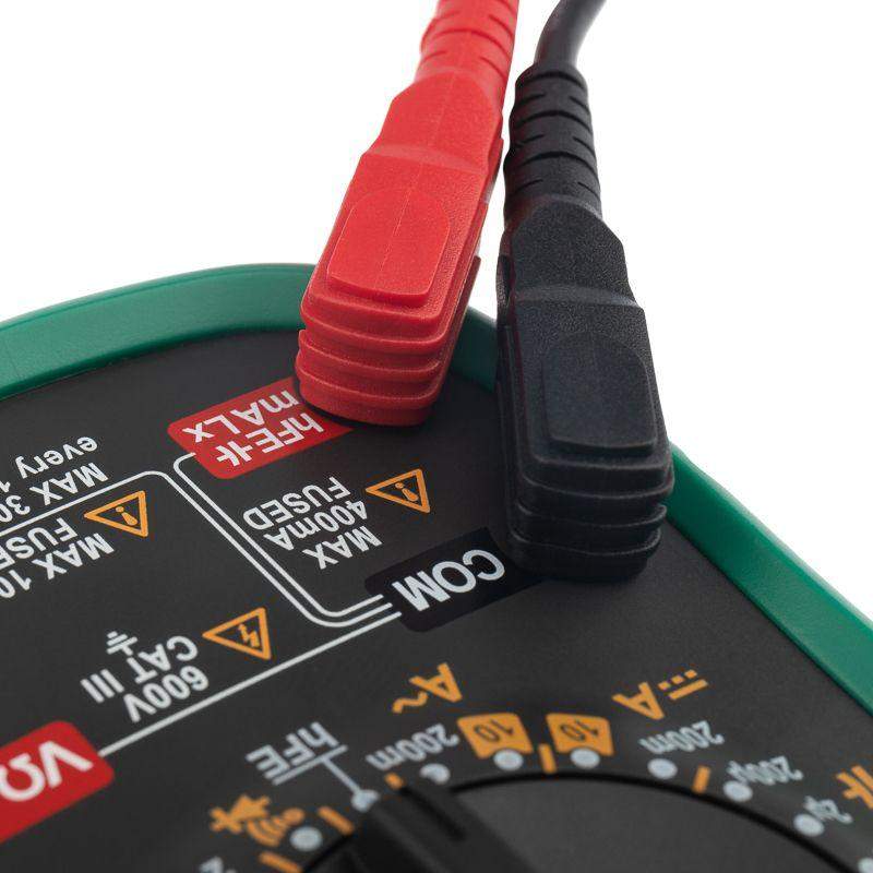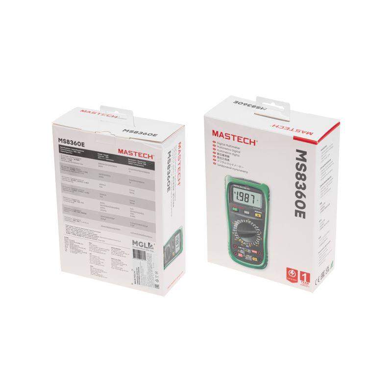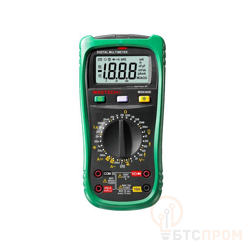 Мульти?метр — электроизмерительный прибор, который включает в себя несколько функций и набор измеряемых параметров. Все приборы серии MS8360 измеряют постоянное и переменное напряжение, а также постоянный и переменный ток, сопротивление в цепи. С помощью данного прибора можно проводить тестирование диодов, прозвонку целостности цепи и измерение коэффициента усиления транзисторов. Кроме того, мультиметр MS8360E оборудован специальным датчиком (NCV), с помощью которого вы бесконтактно сможете определить есть ли напряжение на участке, например в розетке, если есть необходимость демонтировать ее, то с помощью данного мультиметра вы сможете сразу узнать если ли в ней напряжение. Таким образом, один прибор сможем заменить сразу несколько устройств одновременно. Но заточен данный мультиметр на измерение емкости и индуктивности, поэтому и носит название измеритель емкости и индуктивности. Прибор MS8360E является портативным мультиметром, компактные размеры позволяют всегда носить его с собой. Но, несмотря на размеры, данный мультиметр обладает широким функционалом и это выгодно отличает его от других. Прибор имеет функцию удержания результата измерений DATA HOLD, для тех случаев, когда измерения проводятся в труднодоступных местах и не всегда есть возможность взглянуть на экран. Дисплей прибора оснащен подсветкой, которая позволяет проводить измерения даже в слабоосвещенных местах. Инженеры старались сделать прибор максимально удобным для использования. Выбор измеряемых величин и пределов измерений производится с помощью усиленного поворотного регулятора, благодаря которому исключается возможность случайного нажатия. Прибор изготовлен из высококачественных материалов, калибровка и тестирование приборов произведены под контролем компании СДС. Характеристики: Постоянное напряжение: 200 mВ/2 В/20 В/200 В/600 В (±0,5%+2) Переменное напряжение: 2 В/20 В/200 В/600 В (0,8%+3) Постоянный ток: 200 мкА (±1.0 % +5), 10 A (±2,0%+5) Переменный ток: 200 мкА (±1.5 % +5), 10 A (±3,0%+5) Сопротивление: 200 Ом/2 КОм/20 КОм/200 Ком/2 МОм (±0.8% +5), 20 МОм (±5,0%+5) Емкость: 20 нФ/200 нФ/2 мкФ/200 мкФ (±4,0%+5) Индуктивность: 20 мГн/200 мГн/2 Гн/20 Гн (±3,0%+8) 4-разрядный дисплей Ручной выбор предела измерений Тестирование диодов Прозвонка целостности цепи Бесконтактный детектор напряжения (NCV) Коэффициент усиления транзисторов(hFE): 0~ 1000 Дисплей с подсветкой Режим удержания измерений DATA HOLD Импеданс: <50Ом Размер: 188х92х50 мм Тип батареи: 9 В «Крона»