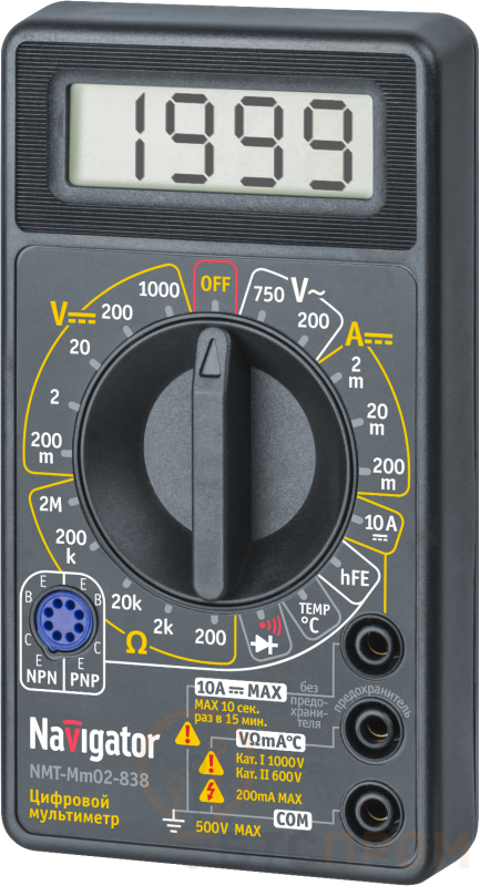 Цифровые мультиметры Navigator используются для проведения измерений электротехнических параметров сети и приборов при электромонтажных работах в быту и на производстве. 3,5 разрядный ЖК-дисплей с автоопределением полярности, максимальное показание дисплея 1999. Надежный многопозиционный переключатель режимов работы и пределов измерений. Автоматическая индикация перегрузки. Индикатор низкого заряда батареи. Тестовые щупы и батарея в комплекте. Характеристики: Постоянное напряжение: 200мВ, 2В, 20В, 200В, 1000В Переменное напряжение: 200В, 750В Постоянный ток: 2мА, 20мА, 200 мА, 10А Сопротивление: 200Ом, 2кОм, 20кОм, 200кОм, 2МОм Проверка диодов: 2,8В / 1мА Измерение температуры: -20....+400 °C