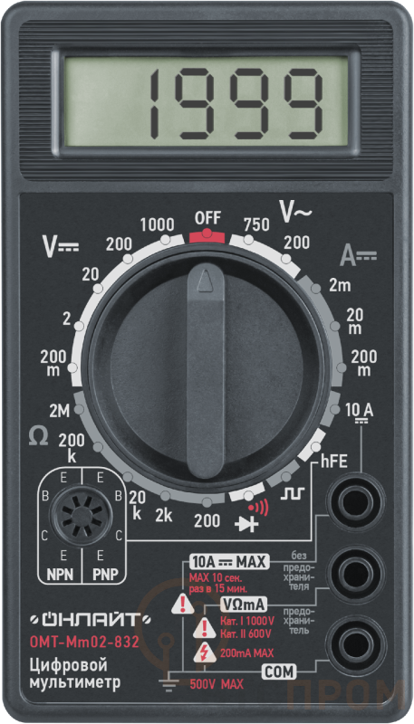 Цифровые мультиметры Онлайт Монтаж OMT-Mm02 используются для проведения измерений электротехнических параметров сети и приборов при электромонтажных работах в быту и на производстве. 3,5 разрядный ЖК-дисплей с автоопределением полярности, максимальное показание дисплея 1999. Надежный многопозиционный переключатель режимов работы и пределов измерений. Автоматическая индикация перегрузки. Индикатор низкого заряда батареи. Тестовые щупы и батарея в комплекте. Характеристики: Постоянное напряжение: 200мВ, 2В, 20В, 200В, 1000В Переменное напряжение: 200В, 750В Постоянный ток: 2мА, 20мА, 200 мА, 10А Сопротивление: 200Ом, 2кОм, 20кОм, 200кОм, 2МОм Проверка диодов: 2,8В / 1мА