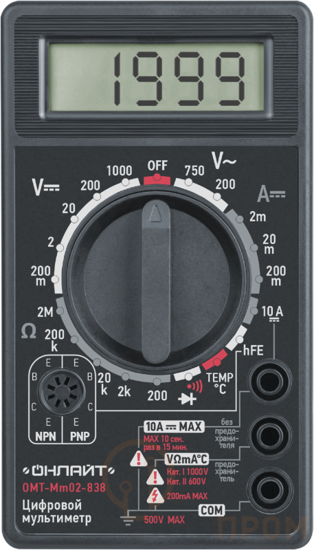 Цифровые мультиметры Онлайт Монтаж OMT-Mm02 используются для проведения измерений электротехнических параметров сети и приборов при электромонтажных работах в быту и на производстве. 3,5 разрядный ЖК-дисплей с автоопределением полярности, максимальное показание дисплея 1999. Надежный многопозиционный переключатель режимов работы и пределов измерений. Автоматическая индикация перегрузки. Индикатор низкого заряда батареи. Тестовые щупы и батарея в комплекте. Характеристики: Постоянное напряжение: 200мВ, 2В, 20В, 200В, 1000В Переменное напряжение: 200В, 750В Постоянный ток: 2мА, 20мА, 200 мА, 10А Сопротивление: 200Ом, 2кОм, 20кОм, 200кОм, 2МОм Проверка диодов: 2,8В / 1мА Измерение температуры: -20....+1000 °C