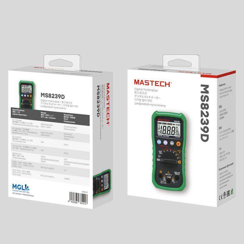 Портативный мультиметр MS 8239D представляет из себя компаткный мультиметр позволяющий работать и с обычной электрикой и с электрикой автомобилей, при этом имеет две дополнительные функции DWELL (частота вращения двигателя) и TACH (угол замкнутого состояния контактов). Мультиметр MS8239D имеет как автоматический, так и ручной режим выбора предела измерения. Мультиметр имеет функцию автоматического отключения, фиксацию текущего и максимального измеренного значения на дисплее. Технические характеристики: Разрядность шкалы: 2000 отсчетов. Постоянное напряжение: 200 мВ/2 В/20 В/200 В/600 В ±(0,7%+2). Перем. напряжение: 200 мВ/2 В/20 В/200 В ±(0,8%+3), 600 В ±(1,0%+3). Пост. ток: 2 А/10 A ±(2,0%+10). Перем. ток: 2 А/10 A ±(3,0%+10). Сопротивление: 200 Ом/2 кОм/20 кОм/200 кОм/2 МОм ±(1,0%+1), 20 МОм ±(1,0%+5). Частота вращения двигателя (тахометр): 4,6,8 цилиндров ±3?. Угол замкнутого состояния контактов (Угол опережения зажигания двигател): 4,6,8 цилиндров ±(3,0%+3). Проверка диодов: прямой ток около 1 мА, обратное напряжение: около 1.5 В. Время обновления результата: около 0.4 секунды. Автовыключение: приблизительно через 15 минут. Питание: батарея 1.5Вx2, тип AAA. Габаритные размеры: 150?74?42 мм. Масса: около 250 г (с батарей питания). Комплект поставки: Мультиметр, щупы, батареи, инструкция