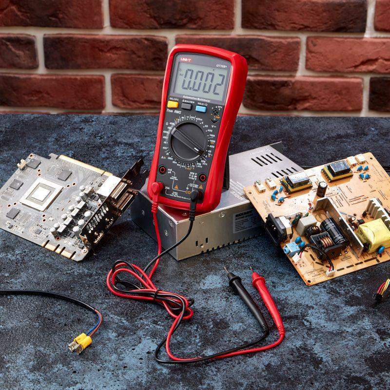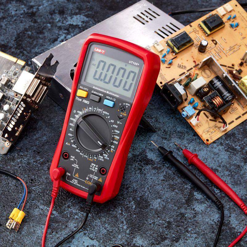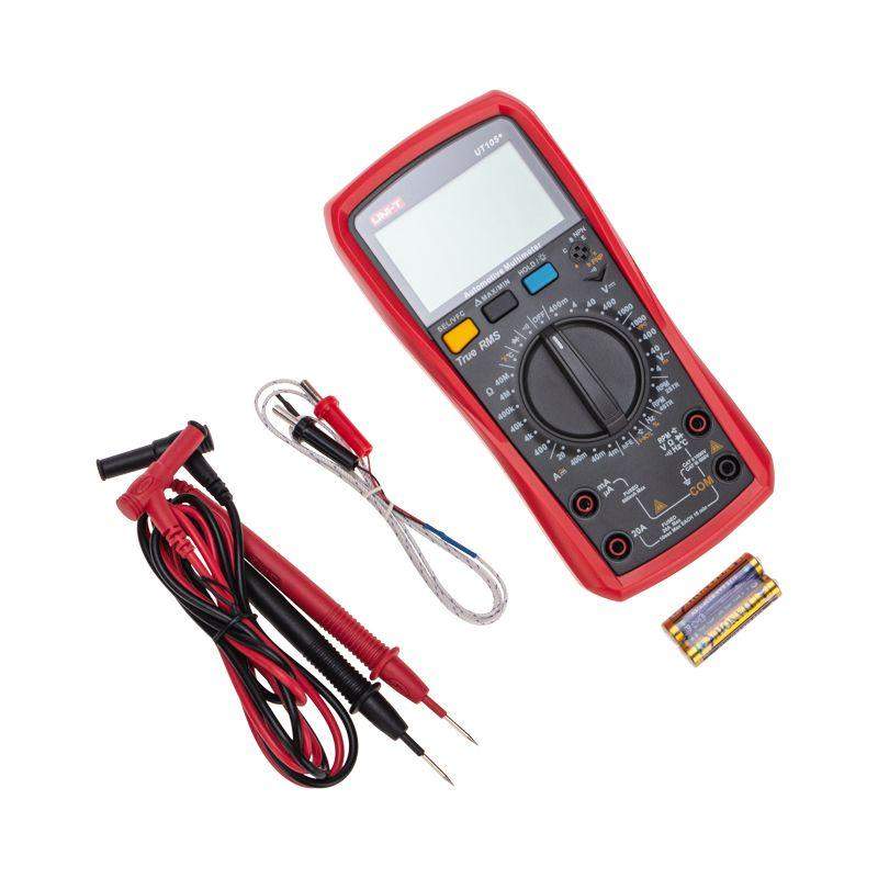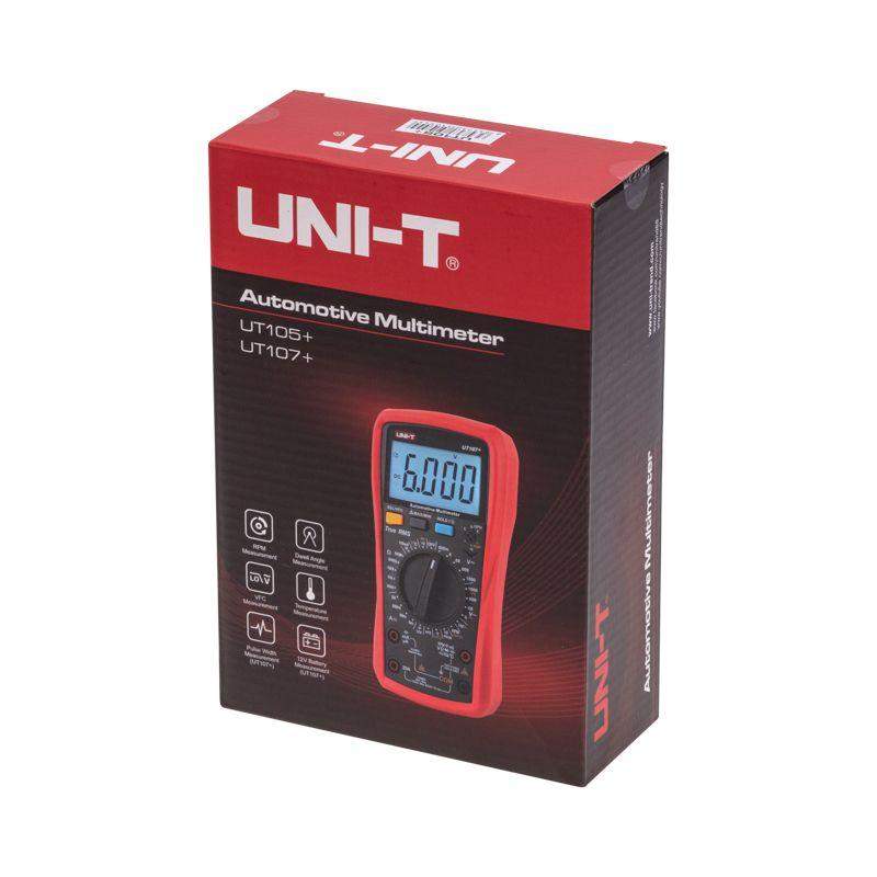 UT105+ представляет собой обновленный TRUE RMS мультиметр, разработанный для снятия электрических и автомобильных параметров. Модель обладает увеличенным до 4000 разрядов дисплеем, новым дизайном корпуса и платы, а также измерением постоянного и переменного тока. При помощи данного устройство можно измерять число оборотов коленчатого вала, угол замкнутого состояния контактов прерывателя трамблера. В устройстве предусмотрена прозвонка межсоединений со звуковым сигналом, подсветка дисплея и диодный тест. Прибор имеет режимы относительных, максимальных и минимальных измерений и оснащен функцией сохранения показаний DATA HOLD. При перегрузке по напряжению и току, отрицательной полярности или разряде батареи срабатывает индикация. Питание: батареи: 2 шт х1.5 В ААА. Размер 183x88x56 мм. Вес: 0,348 кг В комплект поставки входят: мультиметр, мануал, батареи, щупы, термопара. Диапазоны измерений: Постоянное напряжение: 400 мВ/4 В/40 В/400 В/1000 В ± (0.5%+3) Переменное напряжение: 4 В/40 В/400 В/1000 В ± (0.8%+3) Переменный ток: 4мA/40мA/400мA/10A (20А до 10 сек максимально) ± (1.0%+8) Постоянный ток: 4мA/40мA/400мA/10A (20А до 10 сек максимально) ± (0.8%+8) Сопротивление: 400 Ом/4 кОм/40 кОм/400 кОм/4 МОм/40 МОм ± (0.8%+3) Частота: 10Гц~10МГц ± (0.1%+5) Температура: –40~1000 °С ± (1.0%+3) -40?~1832? ± (1.5%+5) Режим VFC: 1000В ±(2.0%+10) Измерение угла опережения зажигания: 1CYL(0~356.4°)/2CYL(0~178.2°)/3CYL(0~118.8°)/4CYL(0 89.1°)/5CYL(0~71.3°)/6CYL(0~59.4°)/8CYL(0~44.5°) ±(3.0%+5) Скорость вращения двигателя: 2STR ±(3.0%+5), 4STR ±(3.0%+5)