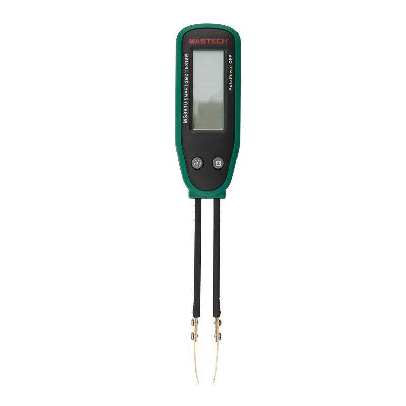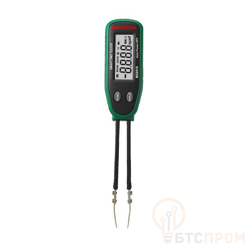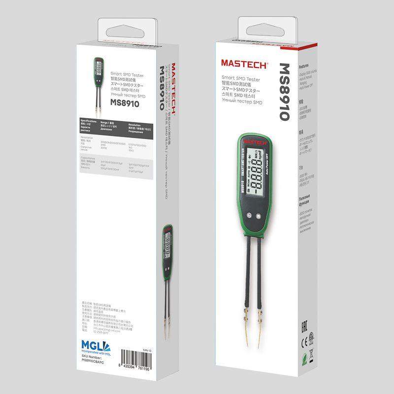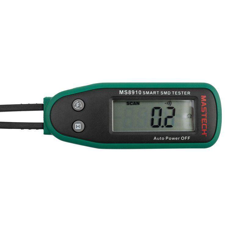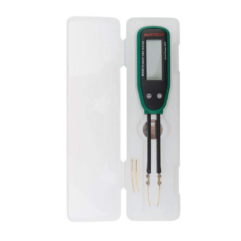 Измерительный прибор MS8910 предназначен для проверки сопротивления и емкости SMD компонентов, а также для проверки целостности цепи и тестировании диодов. Чип компоненты или (SMD) очень маленькие по размеру и проверять их обычным мультиметром со стандартными щупами не очень удобно, так как размер наконечников щупов зачастую сопоставим с размерами тестируемого компонента. Для этих целей лучше всего и подходит MS8910. Он выполнен в компактном корпусе в виде пинцета, что значительно упрощает работу при тестировании SMD компонентов. Прибор прост в применении и не требует дополнительных знаний или навыков для работы с ним. Выбор пределов измерения производится автоматически, нужно лишь выбрать с помощью кнопки FUNC что измерять: емкость или сопротивление. Измерительные щупы очень тонкие, специально спроектированы для удобного использования при тестировании ЧИП элементов, которые можно заменить на запасные в случае поломки. Питание прибора производится от 3-вольтовой дисковой батарейки CR2032. Прибор поставляется в комплекте с пластиковым кейсом. Характеристики: Автоматическое определение типа компонента (резистор, емкость, диод) Автоматический выбор пределов измерений Возможность ручного выбора функция и пределов измерений Разрядность шкалы дисплея: 3000 отсчетов Сопротивление:300 Ом…30 МОм, базовая погрешность ±1% ±2 единицы счета Емкость конденсаторов: 3нФ…30 мФ, базовая погрешность ±2,5% ±3 единицы счета Звуковая прозвонка: сигнал при сопротивлении менее ~30 Ом Тест диодов Фиксация показаний дисплея (HOLD) Автоматическое отключение питания: после 10 минут простоя Индикация перегрузки: символ «OL» на ЖК-дисплее Индикатор разряда батарей Диапазон рабочих температур: 0...+40 °С Диапазон температур хранения: -10...+50 °С Питание: батарея 1 шт. х 3 В тип CR2032 Комплект поставки: прибор, футляр, запасные контакты – 2 шт., батарея, инструкция по эксплуатации Размеры: 170х31х7 мм Масса: 49 г Масса с упаковкой: 150 г
