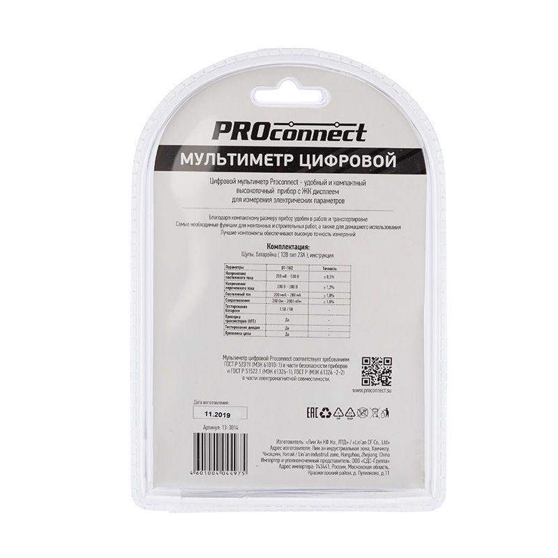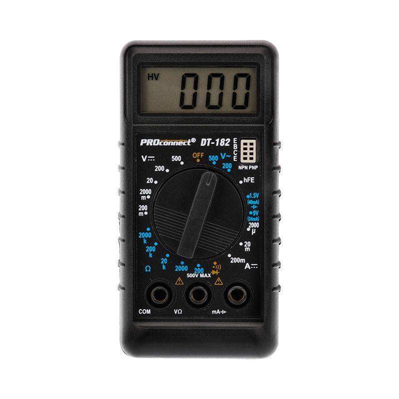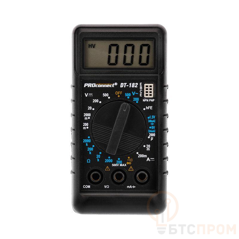 Мультиметр — электроизмерительный прибор, который включает в себя несколько функций и набор измеряемых параметров. Цифровой портативный мультиметр PROconnect DT-182 представляет собой субкомпактный 3,5-разрядный прибор, предназначенный для измерения постоянного и переменного напряжения, постоянного тока, сопротивления, проверки диодов, транзисторов, прозвонки соединений, а также проверки батареек. Самый компактный из приборов PROconnect. Прибор изготовлен из высококачественных материалов, калибровка и тестирование приборов произведены под контролем компании СДС. Характеристики: Постоянное напряжение: 200 mВ - 500 В (±0.5%) Переменное напряжение: 200 В - 500 В (±1,2% +10) Постоянный ток: 200 мкА - 200 мА (±1,8%) Сопротивление: 200 Ом/2000 КОм (±1,0%) Тестирование диодов Тестирование батареек Прозвонка цепи Проверка транзисторов (hFE) 3,5-разрядный дисплей Размер: 100х50х20 мм Тип батареи: 23 А 12 В (в комплекте) Вес: 60 г Комплектация: мультиметр, измерительные щупы, батарея, инструкция, упаковка.