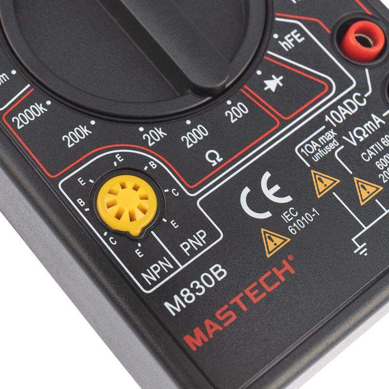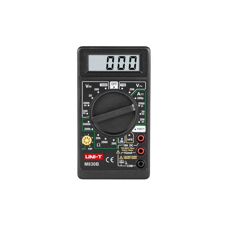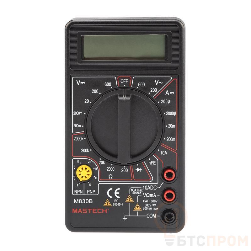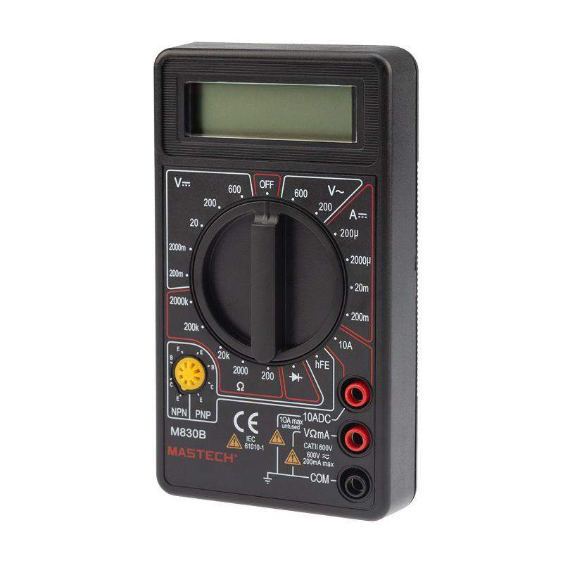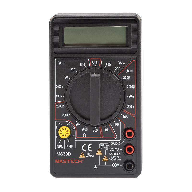 Мультиметр — электроизмерительный прибор, который включает в себя несколько функций и набор измеряемых параметров. Все приборы серии M830 измеряют постоянное и переменное напряжение, постоянный ток и сопротивление в цепи. А также с помощью данного прибора можно проводить тестирование диодов. Прибор M830B является портативным мультиметром, компактные размеры позволяют всегда носить его с собой. Но, несмотря на малые размеры, данный мультиметр обладает широким функционалом и это выгодно отличает его от других. Инженеры старались сделать прибор максимально удобным для использования. Выбор измеряемых величин и пределов измерений производится с помощью усиленного поворотного регулятора, благодаря которому исключается возможность случайного нажатия. Прибор изготовлен из высококачественных материалов. Калибровка и тестирование приборов произведены под контролем компании СДС. Характеристики: Постоянное напряжение: 200 mВ/2 В/20 м/200 В (±0,5%), 600 В (±0.8%) Переменное напряжение: 200 В/600 В (±1,2%) Постоянный ток: 200 мкА/2 мА/20 мА (±1.0%), 200 мА (±1.5%), 10 A (±3.0%) Сопротивление: 200 Ом/2 КОм/20 КОм/200 Ком (±0.8%), 2 Мом (±1%) Коэффициент усиления транзисторов h21: до 1000 3-разрядный дисплей Тестирование диодов Ручной выбор предела измерений Размер: 70х126х24 мм Тип батареи: 9 В «Крона» Вес: 170 г