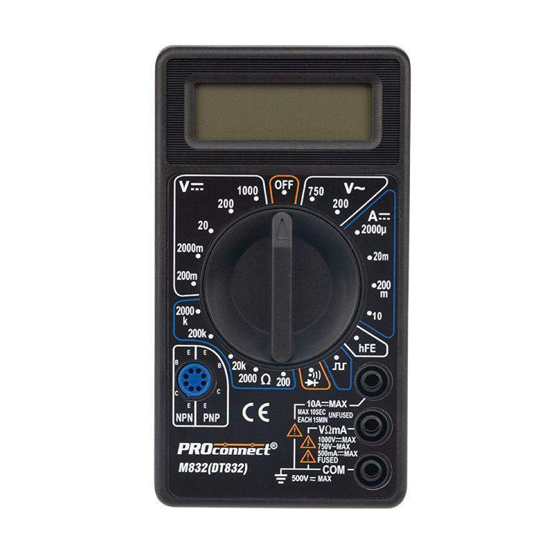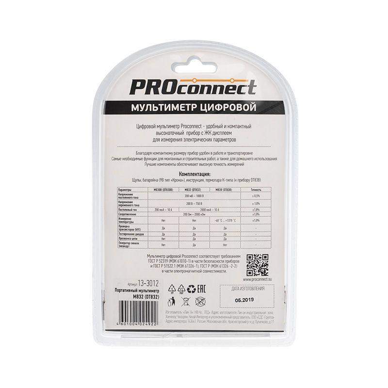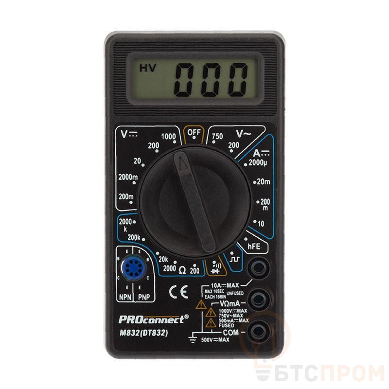 Мультиметр — электроизмерительный прибор, который включает в себя несколько функций и набор измеряемых параметров. Все приборы серии M832 измеряют постоянное и переменное напряжение, постоянный ток и сопротивление в цепи. А также с помощью данного прибора можно проводить тестирование диодов, и осуществлять прозвонку целостности цепи. Еще одной отличительной особенностью данного прибора является функция генерирования прямоугольных сигналов (меандр), эта функция нужна для измерений и преобразований сигнала и в других областях. Прибор M832 является портативным мультиметром, компактные размеры позволяют всегда носить его с собой. Но, несмотря на малые размеры, данный мультиметр обладает широким функционалом и это выгодно отличает его от других. Инженеры старались сделать прибор максимально удобным для использования. Выбор измеряемых величин и пределов измерений производится с помощью усиленного поворотного регулятора, благодаря которому исключается возможность случайного нажатия. Прибор изготовлен из высококачественных материалов, калибровка и тестирование приборов произведены под контролем компании СДС. Характеристики: Постоянное напряжение: 200 mВ (±0.5%+3), 2000 мВ/20 В/200 В (±0,8%+5), 1000 В (±1,0%+5) Переменное напряжение: 200 В/750 В (±2,0%+10) Постоянный ток: 200 мкА/2000 мкА/20 мА (±1.8%+2), 200 мА (±2,0%+2), 10 A (±2.0%+10) Сопротивление: 200 Ом (±1,0%+10), 200 Ом/20 КОм/200 КОм/2000 КОм (±1,0%+4) Тестирование диодов Прозвонка целостности цепи Генератор прямоугольного сигнала (меандр) 3,5-разрядный дисплей Размер: 70х126х26 мм Тип батареи: PROconnect 9 В «Крона» (в комплекте) Вес: 108 г Комплектация: мультиметр, измерительные щупы, батарея, инструкция, упаковка.