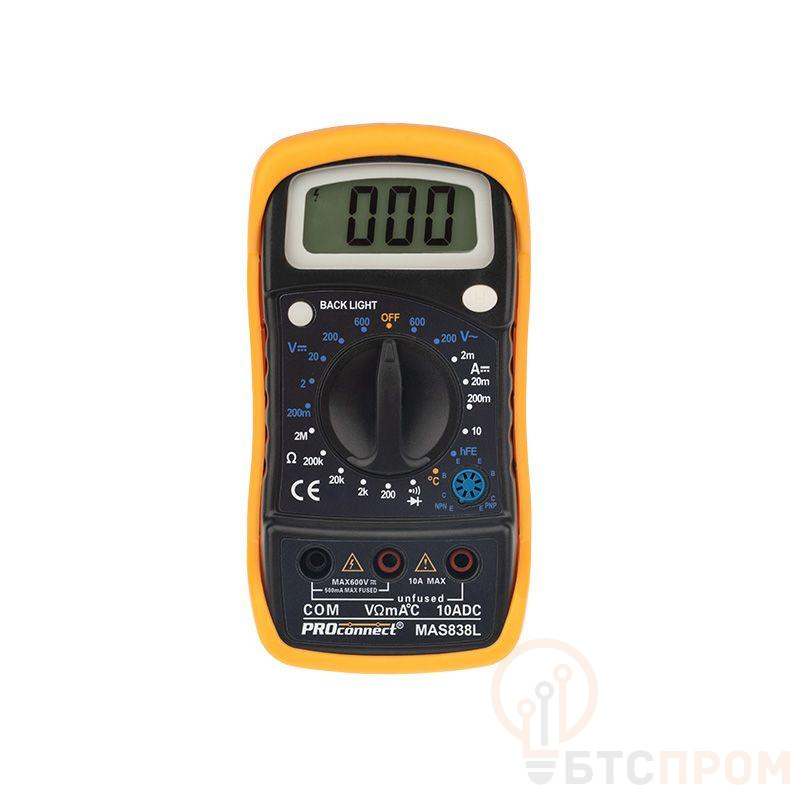 Мультиметр — электроизмерительный прибор, который включает в себя несколько функций и набор измеряемых параметров. Все приборы серии MAS830 измеряют постоянное и переменное напряжение, постоянный ток, сопротивление в цепи и температуру (для модели 838L). А также с помощью данного прибора можно проводить тестирование диодов и прозвонку целостности цепи. Данные приборы являются более совершенными в линейке мультиметров PROconnect, имеют противоударный бампер, функцию удержания данных на дисплее DATA HOLD — позволяет запомнить данные, если измерение проводится в труднодоступном месте, функцию подсветки дисплея — поможет в темноте или отсутствии электричества и освещения. Прибор MAS830L является портативным мультиметром, компактные размеры позволяют всегда носить его с собой. Но, несмотря на малые размеры, данный мультиметр обладает широким функционалом и это выгодно отличает его от других. Инженеры старались сделать прибор максимально удобным для использования. Выбор измеряемых величин и пределов измерений производится с помощью усиленного поворотного регулятора, благодаря которому исключается возможность случайного нажатия. Прибор изготовлен из высококачественных материалов, калибровка и тестирование приборов произведены под контролем компании СДС. Характеристики: Постоянное напряжение: 200 mВ/2 В (±0,5%+3), 20 В/200 В (±0,8%+5), 600 В (±1%+5) Переменное напряжение: 200 В/600 В (±2%+10) Постоянный ток: 2 мА/20 мА (±1,8%+2), 200 мА(±2,0%+2), 10 A (±2,0%+10) Сопротивление: 200 Ом (±1,0%+10), 2 КОм/20 КОм/200 КОм/2 МОм (±1,0%+4) Тестирование диодов/транзисторов (hfe) Прозвонка целостности цепи Измерение температуры Режим DATA HOLD Подсветка дисплея 3,5-разрядный дисплей Размер: 135х67х33 мм Тип батареи: PROconnect 9 В «Крона» (в комплекте) Противоударный чехол в комплекте Вес: 145 г (включая батарею) Комплектация: мультиметр, измерительные щупы, батарея, термопара тип К, инструкция, упаковка.