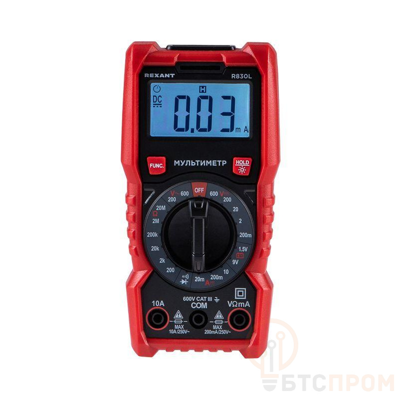 Портативный цифровой мультиметр R830L REXANT представляет собой современное устройство для точных измерений. Имеет ручной выбор диапазонов измерений. Предусмотрена функция удержания данных на дисплее DATA HOLD, которая позволяет запомнить данные, если измерение проводится в труднодоступном месте. Параметры измерений: Постоянное напряжение: 200 мВ/2В/20В/200В ± (0,5%) 600В ± (0,5%) Переменное напряжение: 200 В/600 В ± (1.2%) Постоянный ток: 20мкА/200мкА/20 мА/200мА/ ± (1.0%) 10 А ± (2,0%) Сопротивление: 200 Ом/2кОм/20кОм/200кОм ± (0,8%) 2 МОм ± (1,0%) Основные функции и особенности: Ручной выбор пределов измерений Функция памяти данных DATA HOLD Режим «прозвонка», диод- тест Разрядность дисплея: 2000 отсчетов Количество измерений в секунду: 3 Тест батареек: 1,5В/9В Подсветка дисплея Автоматическое отключение питания через 15 минут Батареи: 1,5 В ААА, 2 шт. Вес с батареями: 220 г Габариты: 151х75х46 мм Комплект поставки: мультиметр, измерительные щупы, батареи, инструкция
