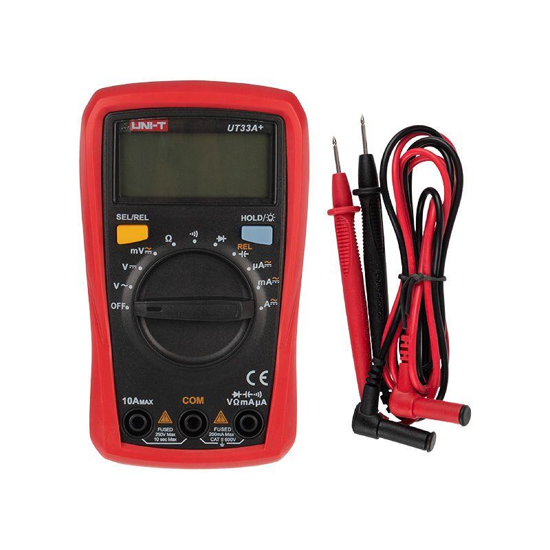 Мультиметр — электроизмерительный прибор, который включает в себя несколько функций и набор измеряемых параметров. Все приборы серии UT-33+ измеряют постоянное и переменное напряжение, постоянный и переменный ток и сопротивление в цепи. А также с помощью данного прибора можно проводить тестирование диодов, транзисторов, батареек и осуществлять прозвонку целостности цепи. Прибор UT33A+ является портативным мультиметром, компактные размеры позволяют всегда носить его с собой. Но, несмотря на малые размеры, данный мультиметр обладает широким функционалом и это выгодно отличает его от других. Инженеры старались сделать прибор максимально удобным для использования. Выбор измеряемых величин производится с помощью усиленного поворотного регулятора, благодаря которому исключается возможность случайного нажатия. UT33A+ имеет функцию автоматического выбора пределов измерений. В отличие от устаревших моделей, где вам приходилось вручную выставлять пределы, сейчас же нужно всего лишь выбрать, какой из параметров вы собираетесь измерять. Прибор изготовлен из высококачественных материалов и комплектуется защитным чехлом, который позволит избежать повреждений прибора от падений и царапин. Мультиметр снабжен подставкой, которая позволяет разместить прибор на любой плоской поверхности. Характеристики: Постоянное напряжение: до 600 В +/- (0,5%+2) Переменное напряжение: до 600 В +/- (0,7%+3) Постоянный ток: до 10 А +/- (1,0%+2) Переменный ток: до 10 А +/- (1,2%+3) Сопротивление: до 200 МОм +/- (0,8%+2) Емкость: до 2 mF +/- (4%+8) 4-разрядный дисплей Автовыбор предела измерений Тестирование диодов Тестирование транзисторов Прозвонка целостности цепи Индикатор разряда батареи Режим удержания измерений DATA HOLD Импеданс: около 10 МОм Размер аппарата: 78х48х134 мм Тип батареи: 1,5 В ААА х 2 Вес: 230 г Комплектация: мультиметр, измерительные щупы, батареи, инструкция, упаковка.