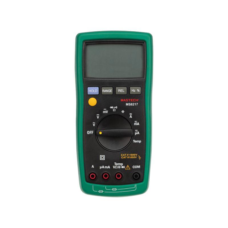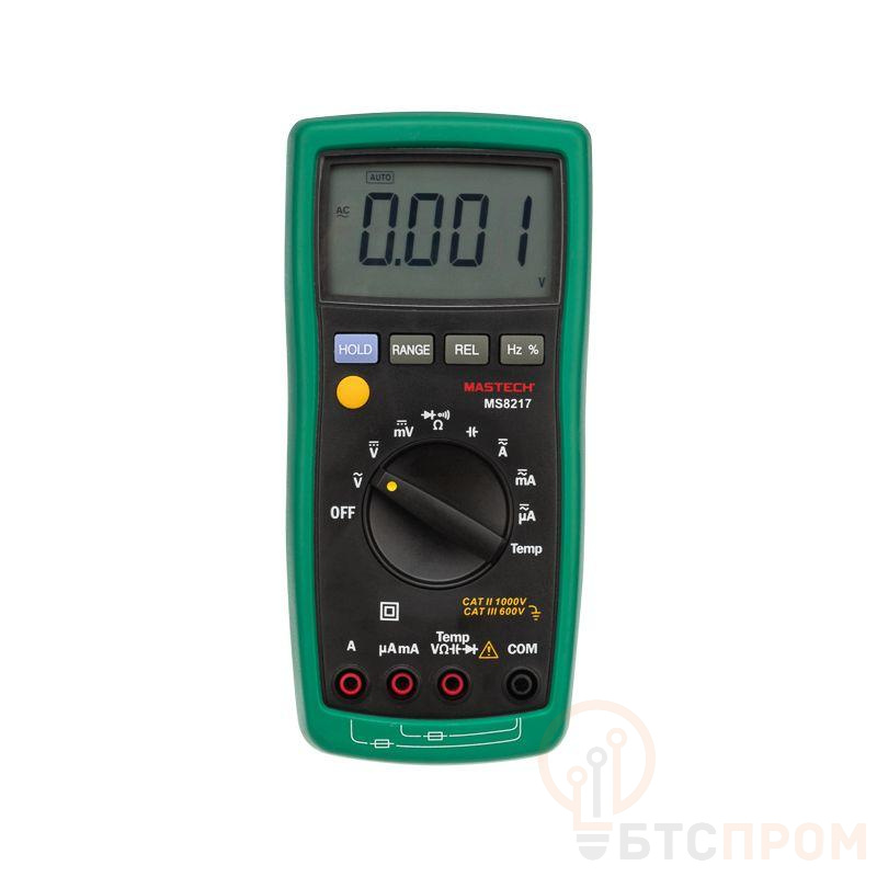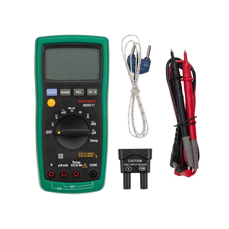 Мультиметр — электроизмерительный прибор, который включает в себя несколько функций и набор измеряемых параметров. Все приборы серии MS8217 измеряют постоянное и переменное напряжение, а также постоянный и переменный ток, сопротивление в цепи, емкость, частоту и даже температуру. С помощью данного прибора можно проводить тестирование диодов и осуществлять прозвонку целостности цепи. Таким образом, один прибор сможем заменить сразу несколько устройств одновременно. Также у этих MS8217 есть режим относительных измерений (REL), который позволяет проводить более точные измерения благодаря вычету влияния электрических параметров самого прибора, ведь как сам прибор, так и его щупы имеют свое сопротивление, индуктивность и емкость. Прибор MS8217 обладает широким функционалом и это выгодно отличает его от других. Прибор имеет функцию удержания результата измерений DATA HOLD для тех случаев, когда измерения проводятся в труднодоступных местах и не всегда есть возможность взглянуть на экран. Инженеры старались сделать прибор максимально удобным для использования. MS8217 имеет функцию автоматического выбора пределов измерений. В отличие от устаревших моделей, где вам приходилось вручную выставлять пределы, сейчас же нужно всего лишь выбрать, какой из параметров вы собираетесь измерять. Кроме того, у прибора усиленный переключатель, благодаря которому исключается возможность случайного нажатия. Калибровка и тестирование приборов произведены под контролем компании СДС. Характеристики: Постоянное напряжение: 400 mВ (±1,0%+10), 4 В/40 м/400 В/1000 В (±0,5%+3) Переменное напряжение: 400 mВ (±3,0%+3), 4 В/40 В/400 В/1000 В (1,0%+3) Постоянный ток: 400 мкА/4000 мкА/40 мА/400 мА/4 А/10 A (±1,5%+3) Переменный ток: 400 мкА/4000 мкА/40 мА/400 мА/4 А/10 A (±1,0%+3) Сопротивление: 400 Ом/4 КОм/40 КОм/400 Ком/4 МОм (±0,5%+2), 40 МОм (±1,5%+3) Емкость: 4 нФ/40 нФ/400 нФ/4 мкФ/40 мкФ/100 мкФ (±3,0%+5) Частота: 50 Гц/500 Гц/5 кГц/50 кГц100 кГц (±0,1%+3) Температура: –55~+1000 °C (±2,0%+2) 4-разрядный дисплей Автоматический выбор предела измерений Режим относительных измерений: REL Тестирование диодов Прозвонка целостности цепи Режим удержания измерений DATA HOLD Импеданс: <50 Ом Размер: 185х87х52 мм Тип батареи: 3 х 1,5 ААА