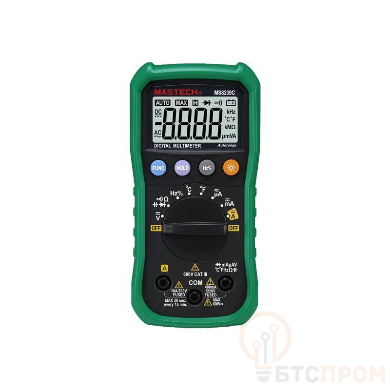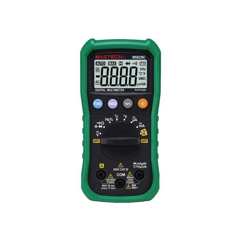 Мультиметр — электроизмерительный прибор, который включает в себя несколько функций и набор измеряемых параметров. Все приборы серии MS8239 измеряют постоянное и переменное напряжение, а также постоянный и переменный ток, сопротивление в цепи, емкость, частоту и даже температуру. С помощью данного прибора можно проводить тестирование диодов и осуществлять прозвонку целостности цепи. Таким образом, один прибор сможем заменить сразу несколько устройств одновременно. Прибор MS8239C является портативным мультиметром высшего класса, компактные размеры позволяют всегда носить его с собой. Но, несмотря на размеры, данный мультиметр обладает широким функционалом и это выгодно отличает его от других. Прибор имеет функцию удержания результата измерений DATA HOLD для тех случаев, когда измерения проводятся в труднодоступных местах и не всегда есть возможность взглянуть на экран. Дисплей прибора оснащен подсветкой, которая позволяет проводить измерения даже в слабоосвещенных местах. Инженеры старались сделать прибор максимально удобным для использования. MS8239C имеет функцию автоматического выбора пределов измерений. В отличие от устаревших моделей, где вам приходилось вручную выставлять пределы, сейчас же нужно всего лишь выбрать, какой из параметров вы собираетесь измерять. Кроме того, у прибора усиленный переключатель, благодаря которому исключается возможность случайного нажатия. Калибровка и тестирование приборов произведены под контролем компании СДС. Характеристики: Постоянное напряжение: 400 mВ/4 В/40 м/400 В/600 В (±0,5%+3) Переменное напряжение: 4 В/40 В/400 В/600 В (1,2%+5) Постоянный ток: 400 мкА/4000 мкА/40 мА/400 мА (±1,0%+5), 10 A (±2,0%+10) Переменный ток: 400 мкА/4000 мкА/40 мА/400 мА(±1,2%+5), 10 A (±2,5%+10) Сопротивление: 400 Ом/4 КОм/40 КОм/400 Ком/4 МОм/40 МОм (±0,8%+5) Емкость: 5 нФ/50 нФ/500 нФ/5 мкФ/50 мкФ/100 мкФ (±3,0%+5) Частота: 0~10KГц (±1,5%+5) Температура: –20~+1000 °C (±2,0%+2) 4-разрядный дисплей Автоматический выбор предела измерений Тестирование диодов Прозвонка целостности цепи Дисплей с подсветкой Режим удержания измерений DATA HOLD Импеданс: <50 Ом Размер: 150х74х41 мм Тип батареи: 2 х 1,5 В ААА