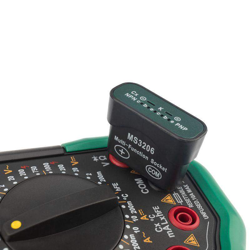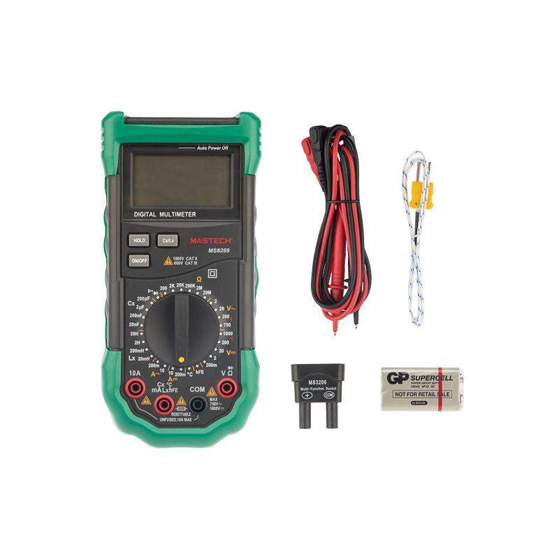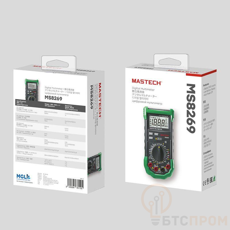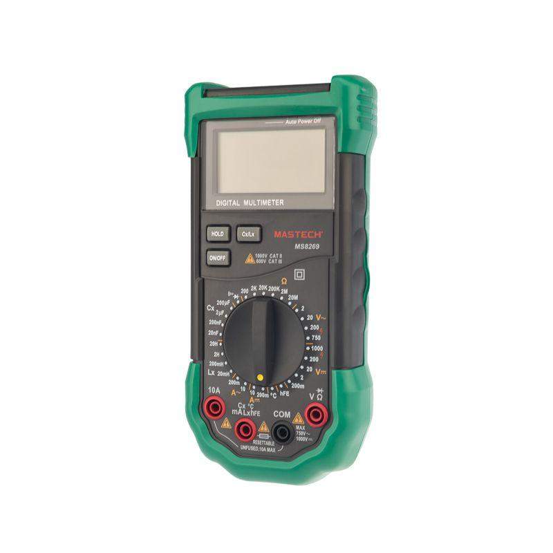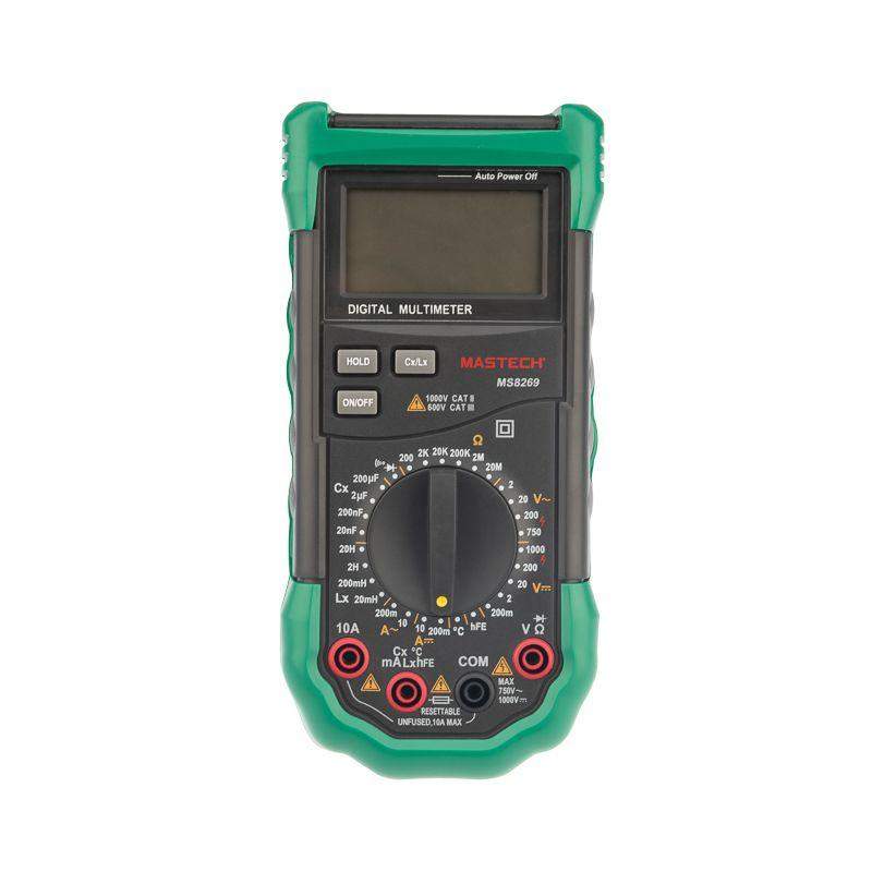 Мультиметр — электроизмерительный прибор, который включает в себя несколько функций и набор измеряемых параметров. Все приборы серии MS826* измеряют постоянное и переменное напряжение, а также постоянный и переменный ток, сопротивление в цепи, емкость, индуктивность и даже температуру. С помощью данного прибора можно проводить тестирование диодов и осуществлять прозвонку целостности цепи. Таким образом, один прибор сможем заменить сразу несколько устройств одновременно. Данный мультиметр обладает широким функционалом и это выгодно отличает его от других. Прибор имеет функцию удержания результата измерений DATA HOLD для тех случаев, когда измерения проводятся в труднодоступных местах и не всегда есть возможность взглянуть на экран. Дисплей прибора оснащен подсветкой, которая позволяет проводить измерения даже в слабоосвещенных местах. Дополнительно входные гнезда прибора оснащены системой звукового и светового оповещения о неправильном подключении. Инженеры старались сделать прибор максимально удобным для использования. Выбор измеряемых величин и пределов измерений производится с помощью усиленного поворотного регулятора, благодаря которому исключается возможность случайного нажатия. Прибор изготовлен из высококачественных материалов, калибровка и тестирование приборов произведены под контролем компании СДС. Характеристики: Постоянное напряжение: 200 mВ/2 В/20 В/200 В/1000 В (±0,5%+2) Переменное напряжение: 2 В/20 В/200 В/750 В (0,8%+3) Постоянный ток: 200 мкА (±1.5 % +1), 10 A (±2,0%+5) Переменный ток: 200 мкА (±1.8 % +3), 10 A (±3,0%+7) Сопротивление: 200 Ом/2 КОм/20 КОм/200 Ком/2 МОм/20 МОм (±0,8%+3) Емкость: 20 нФ/200 нФ/2 мкФ/200 мкФ (±4,0%+8) Индуктивность: 20 мГн/200 /2 Гн//20 Гн (±3,0%+8) Температура: –20~+1000 °C (±2,0%+2) 4-разрядный дисплей Ручной выбор предела измерений Тестирование диодов Прозвонка целостности цепи Коэффициент усиления транзисторов(hFE): 0~ 1000 Дисплей с подсветкой Режим удержания измерений DATA HOLD Импеданс: <50 Ом Размер: 195х92х55 мм Тип батареи: 9 В «Крона»