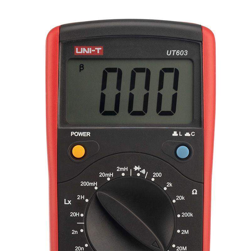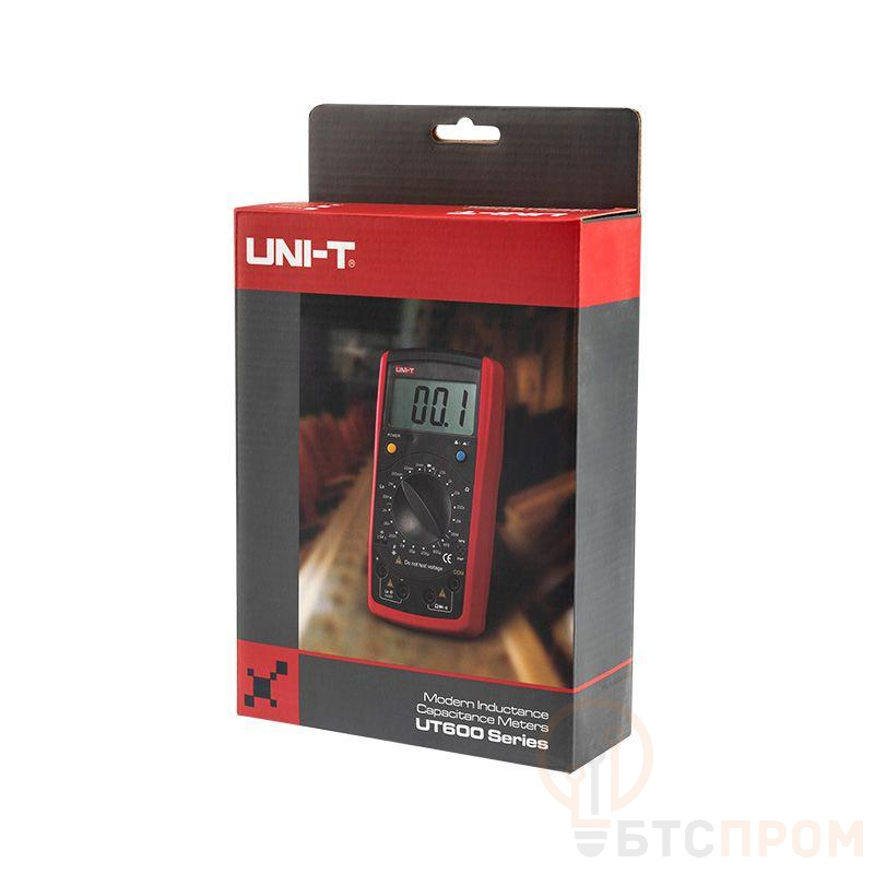 Измеритель иммитанса UT603 (измеритель RLC) — радиоизмерительный прибор, предназначенный для определения параметров полного сопротивления или полной проводимости электрической цепи. Название прибора складывается из измеряемых прибором величин: R — Сопротивление, С — Емкость, L — Индуктивность. Иммитанс — обобщающее понятие для полного (комплексного) сопротивления — импеданса и полной (комплексной) проводимости — адмиттанса. Данный прибор, кроме своих основных функций, также оснащен функцией тестирования диодов и прозвонки целостности цепи. Инженеры старались сделать прибор максимально удобным для использования и все переключения удобно производить даже одной рукой, но, несмотря на это, у прибора усиленный поворотный регулятор, благодаря которому исключается возможность случайного нажатия. Прибор изготовлен из высококачественных материалов. Изделие комплектуется специальным чехлом, который защитит прибор от внешних механических повреждений. Калибровка и тестирование приборов произведены под контролем компании СДС. Измеритель иммитанса снабжен подставкой, которая позволяет разместить прибор на любой плоской поверхности. Характеристики: Сопротивление: 200 Ом/2 kОм/20 kОм/200 kОм/2 MОм/20 MОм (0.8%+1) Емкость: 2 нФ/20 нФ/200 нФ/2 мФ/20 мФ/200 мФ/600 мФ (1%+5) Индуктивность: 2 мГн/20 мГн/200 мГн/2 Гн/20 Гн (2%+8) 4-разрядный дисплей Ручной выбор предела измерений Тестирование диодов Прозвонка целостности цепи Режим удержания измерений DATA HOLD Индикатор разряда батареи Импеданс: около 10 МОм Размер: 172х83х38 мм Тип батареи: 9 В «Крона» Вес: 312 г