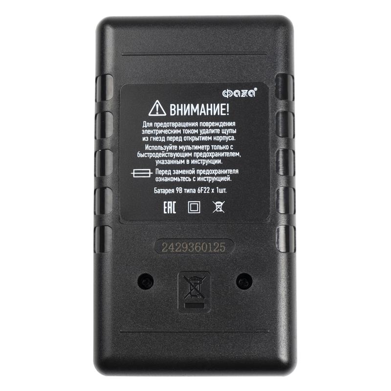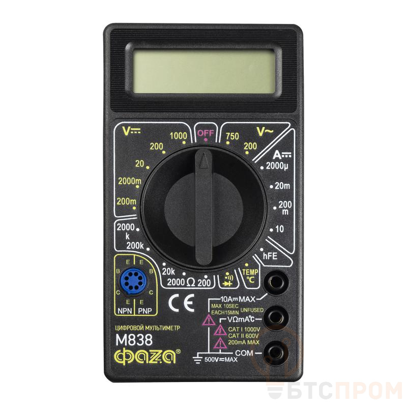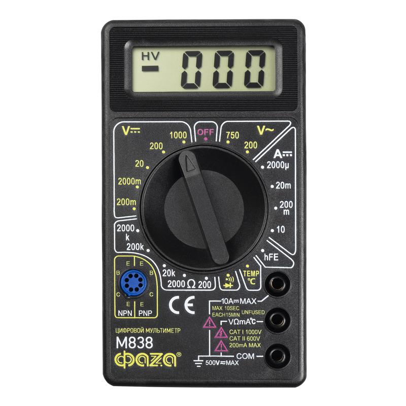 3.5 цифр.мультиметр. Изм.пост.и перем.напр-я, пост.тока, сопр., температуры. Диод тест. Проверка транзисторов. Прозвонка. Защита от перегрузки. Индикация полярности, разряда бат. CAT II 600В, CAT I 1000В. Комплект - бат.9В, щупы.Цв.коробка с подвесом