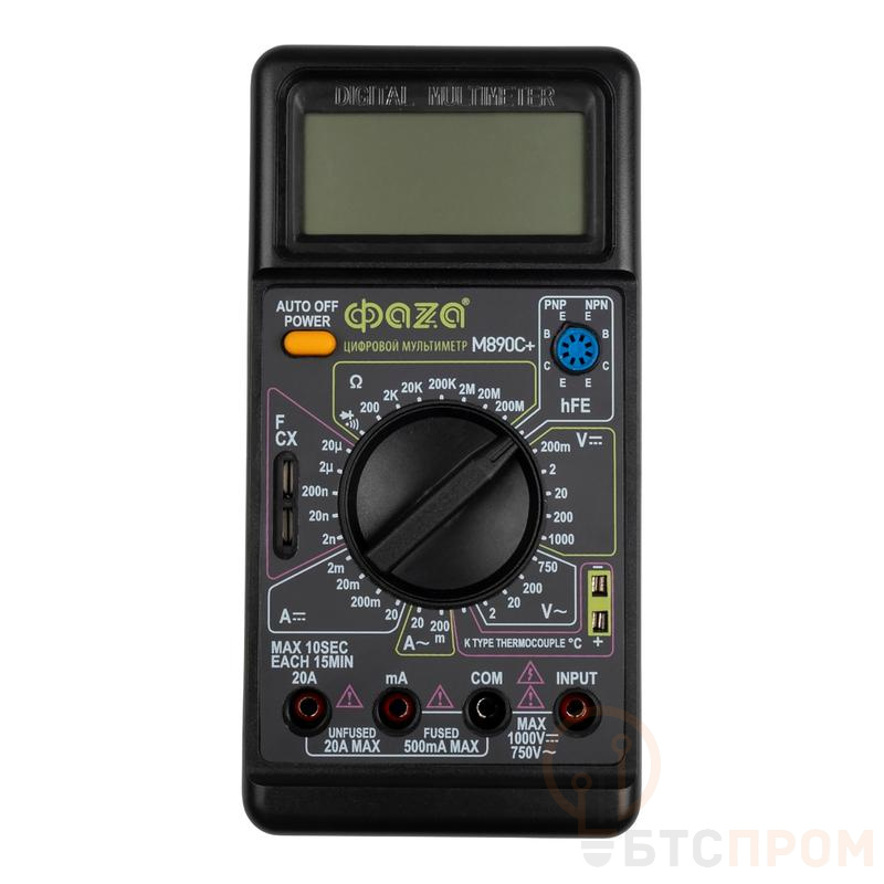 3.5 цифр.мультиметр. Изм.пост.и перем.напр-я, пост.и перем.тока, сопр.,температуры. Прозвонка. Диод тест. Проверка транзисторов. Защита от перегрузки. Индикация полярности, разряда бат. CAT I 1000В. Комплект - бат.9В, щупы.Цв.коробка с подвесом