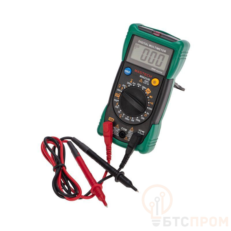 Мультиметр — электроизмерительный прибор, который включает в себя несколько функций и набор измеряемых параметров. Все приборы серии MS8233 измеряют постоянное и переменное напряжение, а также постоянный ток и сопротивление в цепи. С помощью данного прибора можно проводить тестирование диодов и осуществлять прозвонку целостности цепи. Также мультиметр MS8233B оборудован специальным датчиком, с помощью которого вы бесконтактно сможете определить, есть ли напряжение на участке, например в розетке, если есть необходимость демонтировать ее, то с помощью данного мультиметра вы сможете сразу узнать, если ли в ней напряжение. Таким образом, один прибор сможем заменить сразу несколько устройств одновременно. Прибор MS8233B является портативным мультиметром, компактные размеры позволяют всегда носить его с собой. Но, несмотря на малые размеры, данный мультиметр обладает широким функционалом и это выгодно отличает его от других. Прибор имеет функцию удержания результата измерений DATA HOLD для тех случаев, когда измерения проводятся в труднодоступных местах и не всегда есть возможность взглянуть на экран. Дисплей прибора оснащен подсветкой, которая позволяет проводить измерения даже в слабоосвещенных местах. Инженеры старались сделать прибор максимально удобным для использования. Выбор измеряемых величин и пределов измерений производится с помощью усиленного поворотного регулятора, благодаря которому исключается возможность случайного нажатия. Прибор изготовлен из высококачественных материалов, калибровка и тестирование приборов произведены под контролем компании СДС. Характеристики: Постоянное напряжение: 200 mВ/2 В/20 м/200 В (±0,5%+3), 600 В (±0,8%+5) Переменное напряжение: 200 В/600 В (1,2%+10) Постоянный ток: 200 мкА/2 мА/20 мА/200 мА(±1,0%+3), 10 A (±3,0%+5) Сопротивление: 200 Ом/2 КОм/20 КОм/200 Ком/2 МОм (±0,8%+4) 4-разрядный дисплей Ручной выбор предела измерений Тестирование диодов Прозвонка целостности цепи Дисплей с подсветкой Бесконтактный детектор напряжения NCV Режим удержания измерений DATA HOLD Импеданс: <50 Ом Размер: 145х73х45 мм Тип батареи: 9 В «Крона»