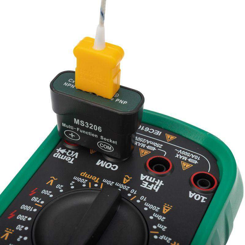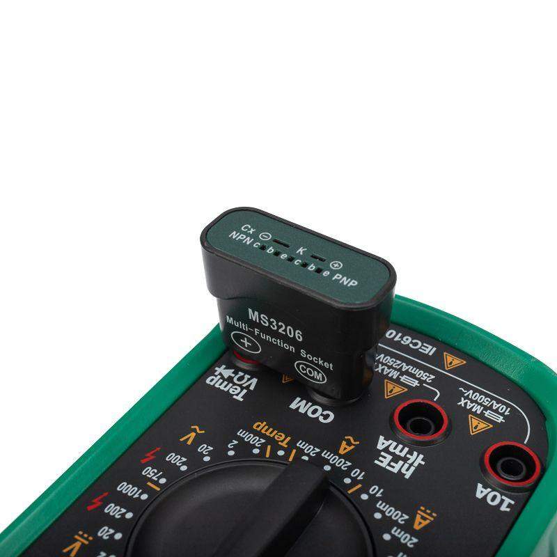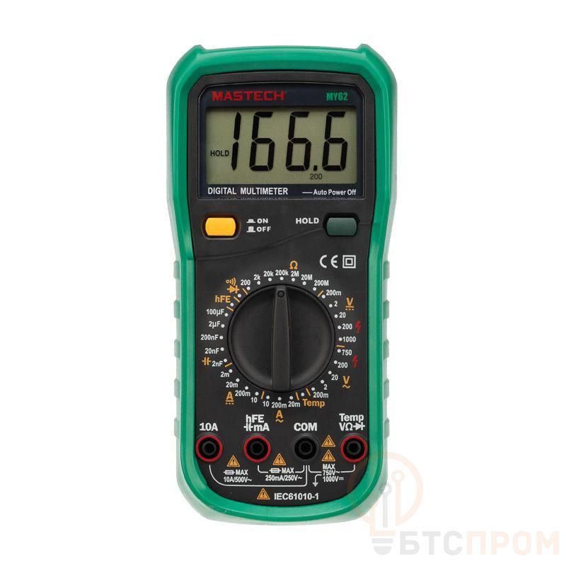 Мультиметр — электроизмерительный прибор, который включает в себя несколько функций и набор измеряемых параметров. Прибор MY62N относится к обновленной серии N, что отразилось на внешнем и внутреннем дизайне, ряде параметров и улучшенной схемотехнике, добавлена функция памяти данных на экране. Прибор измеряет постоянное и переменное напряжение, а также постоянный и переменный ток, сопротивление, емкость в цепи и даже температуру. С помощью данного прибора можно проводить тестирование диодов, прозвонку целостности цепи и измерение коэффициента усиления транзисторов. Таким образом, один прибор сможем заменить сразу несколько устройств одновременно. Прибор MY62N является полноразмерным универсальным мультиметром обновленного форм-фактора с широким функционалом, с большим ручным выбором диапазонов измерений , который можно использовать практически в любой сфере деятельности. Прибор имеет функцию удержания результата измерений DATA HOLD для тех случаев, когда измерения проводятся в труднодоступных местах и не всегда есть возможность взглянуть на экран. Инженеры старались сделать прибор максимально удобным для использования. Выбор измеряемых величин и пределов измерений производится с помощью усиленного поворотного регулятора, благодаря которому исключается возможность случайного нажатия. Прибор изготовлен из высококачественных материалов, калибровка и тестирование приборов произведены под контролем компании СДС. Характеристики: Постоянное напряжение: 200 mВ/2 В/20 мВ/200 В (±0,5%+3), 1000 В (±0,8%+3) Переменное напряжение: 200 мВ/2 В/20 В/200 В (±0,8%+3), 750 В (1,2%+3) Постоянный ток: 2 мА/20 мА/200 мА(±1,5%+1), 10 A (±2,0%+5) Переменный ток: 2 мА/20 мА/200 мА(±1,8%+5), 10 A (±3,0%+5) Сопротивление: 200 Ом/2 КОм/20 КОм/200 Ком/2 МОм(±0,8%+3), 20 МОм (±1,0%+5), 200 МОм (±6,0%+10) Емкость: 2 нФ/20 нФ/200 нФ/2 мкФ (±4%+3),100 мкФ (±6%+10) Температура: –20~+1000 °C (±2,0%+2) 4-разрядный дисплей Ручной выбор предела измерений Тестирование диодов Прозвонка целостности цепи Коэффициент усиления транзисторов(hFE): 0~1000 Режим удержания измерений DATA HOLD Импеданс: <50 Ом Размер: 145х73х45 мм Тип батареи: 9 В «Крона»