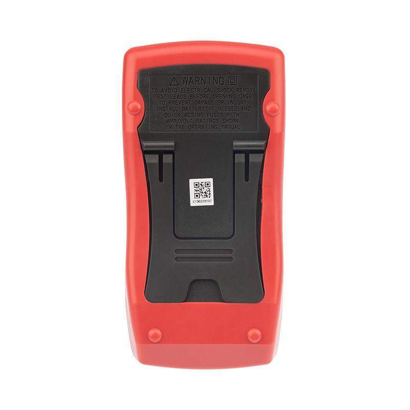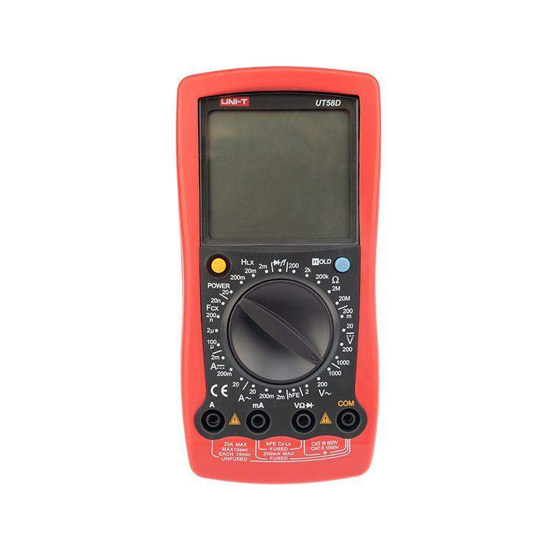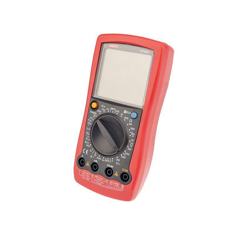 UT58D — это профессиональный мультиметр с современным и эргономичным дизайном. Предназначен прибор для измерений постоянного и переменного напряжения, сопротивления, постоянного и переменного тока. Кроме того, он имеет функцию измерения электрической емкости, а также с его помощью вы сможете тестировать диоды и проводить прозвонку целостности цепи. Мультиметр 58D может измерять индуктивность до 20 генри, что не часто можно встретить в этом классе мультиметров. Данный прибор обладает высоким классом точности показаний. Дисплей прибора оснащен подсветкой, которая позволяет проводить измерения даже в слабоосвещенных местах. Широкий функционал мультиметра UT58D позволяет обходиться без других вспомогательных устройств. Прибор оснащен функцией DATA HOLD, и зафиксировав результат измерений, вы в любое время сможете считать полученный значение. Прибор изготовлен из высококачественных материалов. Калибровка и тестирование приборов произведены под контролем компании СДС. Инженеры старались сделать прибор максимально удобным для использования, и сужение в нижней области корпуса позволяет удобнее располагать прибор в одной руке, а шероховатость корпуса предотвращает выскальзывание. Все переключения удобно производить даже одной рукой, но, несмотря на это, у прибора усиленный поворотный регулятор, благодаря которому исключается возможность случайного нажатия. Характеристики: Постоянное напряжение: 200 мВ/20 В/200 В/1000 В: ± (0. 5% + 1) Переменное напряжение: 2 В/200 В/1000 В: ±(0.8%+3) Постоянный ток: 2 мА/20 мA/20 А (0,8%+1) Переменный ток: 2 мА/20 мA/20 А (1%+3) Сопротивление: 200 Oм/2 kOм/20 kOм/2 мOм/20 мOм (0,8%+1) Емкость: 20 нФ/200 нФ/2 мФ/100 мФ ± (2. 5% + 5) Индуктивность: 2 мГ/20 мГ/200 мГ/20 Г ±(2%+10) Дисплей: 2000 Ручная установка диапазона измерений Тестирование диодов Автовыключение Режим удержания измерений DATA HOLD Прозвонка целостности цепи Индикатор разряда батареи Импеданс: около 10 МОм Размер: 179х88х39 мм Тип батареи: 9 В батарея Комплект поставки: тестер, чехол, щупы, инструкция, батарея, щупы с зажимами типа крокодил