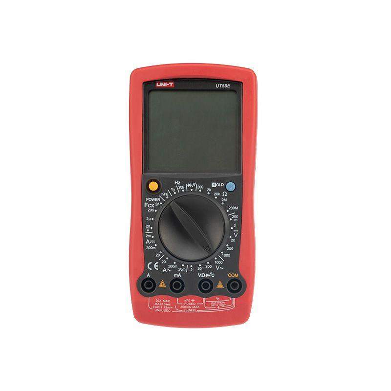 UT58E — это профессиональный мультиметр с современным и эргономичным дизайном. Выделяется из серии приборов UT 58 разрешением дисплея 4 с половиной разряда и самой низкой базовой погрешностью, что делает его наиболее точным. У всех остальных мультиметров этой серии разрешение дисплея составляет три с половиной разряда. Предназначен прибор для измерений постоянного и переменного напряжения, сопротивления, постоянного и переменного тока. Кроме того, он имеет функции измерения электрической емкости, частоты и температуры, а также с его помощью вы сможете тестировать диоды и проводить прозвонку целостности цепи. Данный прибор обладает высоким классом точности показаний. Дисплей прибора оснащен подсветкой, которая позволяет проводить измерения даже в слабоосвещенных местах. Широкий функционал мультиметра UT58E позволяет обходиться без других вспомогательных устройств. Прибор оснащен функцией DATA HOLD, и зафиксировав результат измерений, вы в любое время сможете считать полученный значение. Прибор изготовлен из высококачественных материалов. Калибровка и тестирование приборов произведены под контролем компании СДС. Инженеры старались сделать прибор максимально удобным для использования, и сужение в нижней области корпуса позволяет удобнее располагать прибор в одной руке, а шероховатость корпуса предотвращает выскальзывание. Все переключения удобно производить даже одной рукой, но, несмотря на это, у прибора усиленный поворотный регулятор, благодаря которому исключается возможность случайного нажатия. Характеристики: Постоянное напряжение: 200 мВ/2 В/20 В/200 В/1000 В: ± (0. 05% + 3) Переменное напряжение: 2 В/20 В/200 В/1000 В: ± (0. 5% + 10) Постоянный ток: 20 ?a/2 мА/20 мA/200 мА/20 А ± (0. 5% + 5)) Переменный ток: 2 мА/200 мА/20 А ± (0. 8% + 10) Сопротивление: 200 Oм/2 kOм/20 kOм/2 мOм/200 мOм ± (0. 5% + 10) Емкость: 2 нФ/20 нФ/2 мФ/20 мкФ ± (3% + 4) Температура: –40~+1000 °C ± (1% + 30) Частота: 20 кГц ± (1.5% + 5) Дисплей: 20000 Ручная установка диапазона измерений Тестирование диодов Автовыключение Режим удержания измерений DATA HOLD Прозвонка целостности цепи Индикатор разряда батареи Импеданс: около 10 МОм Размер: 179х88х39 мм Тип батареи: 9 В батарея Комплект поставки: тестер, чехол, щупы, инструкция, батарея, термопара тип К, щупы с зажимами типа крокодил