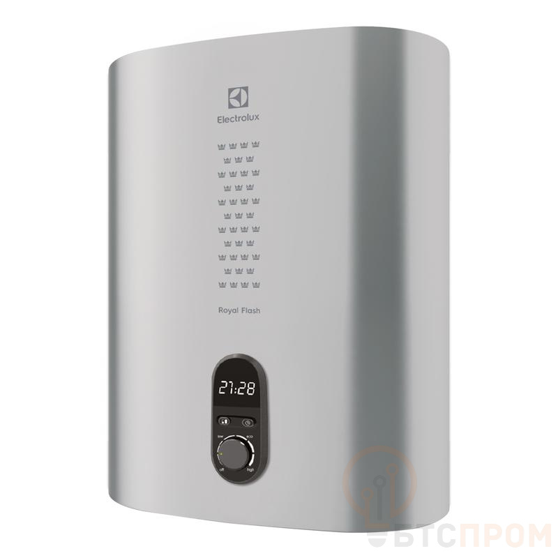 Electrolux EWH Royal Flash электрический накопительный водонагреватель с внутренним баком из нержавеющей стали. _x000D_ Все приборы серии сделаны в России с применением самых передовых технологий на современном оборудовании и имеют премиальную гарантию на внутренние баки – 8 лет. _x000D_ INOX CONSEPT +_x000D_ Внутренний бак изготовлен из высококачественной нержавеющей стали с высоким содержанием антикоррозионных легирующих элементов, таких как хром и никель. Сталь с такими характеристиками более устойчива к коррозии и технологична при обработке, что обеспечивает долговечность и высокую надежность работы водонагревателей. Нержавеющая сталь абсолютно безопасна и одобрена для применения в медицине и пищевом производстве_x000D_ _x000D_ Технология AUTO ARGON WELDING_x000D_ При производстве внутренних баков водонагревателя применяется полностью автоматическая аргонная сварка нового поколения, что позволяет полностью избежать дефектов, связанных с ручным производством, гарантирует безупречное качество сварочных швов и коррозионную стойкость в период эксплуатации. _x000D_ Каждый водонагреватель проходит детальное тестирование после производства, что обеспечивает высокое качество и безупречную работу приборов на долгие годы. _x000D_ _x000D_ Универсальность_x000D_ Водонагреватели серии универсальны при монтаже: их можно устанавливать как вертикально, так и горизонтально, что открывает большие возможности для выбора подходящего места в помещении. Благодаря современной плоской форме и компактным размерам (глубина от 25,3 см) водонагреватели_x000D_ не сложно разместить в любом малогабаритном помещении. _x000D_ _x000D_ _x000D_ Установка таймера_x000D_ Теперь в водонагревателях Electrolux предусмотрена возможность установки таймера или отложенного нагрева — прибор самостоятельно рассчитает время нагрева воды по настройкам пользователя, включится заблаговременно и начнет нагрев. Просто установите время, к которому Вам потребуется горячая вода. _x000D_ _x000D_ Режим половинной мощности_x000D_ На панели управления можно выбрать функцию половинной мощности. Она позволяет экономить электроэнергию и использовать прибор в помещениях с ограниченной мощностью сети, например на даче. Установив полную мощность, включается функция быстрого нагрева до заданной температуры. _x000D_ _x000D_ Интеллектуальное управление_x000D_ С помощью ручки регулировки и LED-дисплея Вы можете установить необходимую температуру нагрева с точностью до 1°C. Во время нагрева на LED-дисплее будет отображаться текущая температура внутри водонагревателя. _x000D_ _x000D_ Экономичный режим_x000D_ В модели EWH Royal Flash есть функция экономного режима, при котором вода будет нагреваться до температуры около 55°С. При такой температуре повышается, рабочий ресурс ТЭНа, происходит обеззараживание воды и практически не образуется накипь. _x000D_ _x000D_ Система безопасности_x000D_ Водонагреватель Elecrtolux EWH Royal Flash имеет многоступенчатую систему безопасности. Специальный термостат не дает воде нагреться выше 75°C. Защита от сухого нагрева отключает нагревательный элемент в случае отсутствия воды в баке, что гарантирует сохранность ТЭНа. Предохранительный сливной клапан уберегает прибор от избыточного давления, а Устройство Защитного Отключения на электрическом кабеле – от утечки электричества. _x000D_ _x000D_ Теплоизоляция_x000D_ Для эффективной теплоизоляции приборов исполь