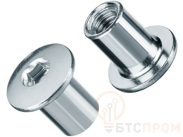 Используется с мебельным винтом для стягивания двух или более деталей, выполнена в форме цилиндара с внутренней метрической резьбой. Шляпка у гайки плоская, шлиц HEX