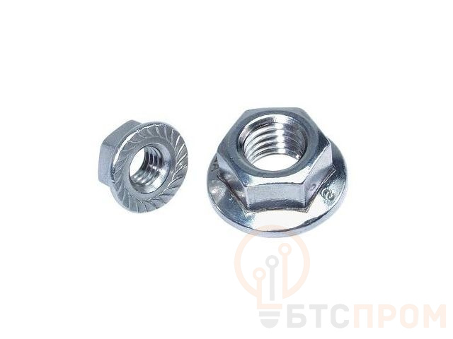 Класс прочности - 6. Применяется в машиностроении и деревообрабатывающем производстве. На фланце имеется рифление, которое обеспечивает надежную фиксацию гайки и предотвращает откручивание.