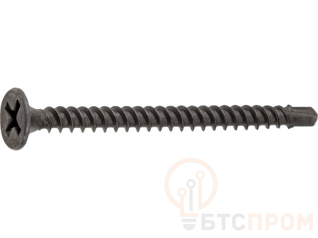 Острый наконечник со сверлом (буром) позволяет вкручивать саморез без предварительного засверливания, значительно экономя время. Фосфатное покрытие (черное) обеспечивает защиту от коррозии и увеличивает долговечность соединения в условиях нормальной влажности.