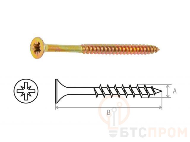 Используется для крепления различных конструкций к дереву, фанере, ДСП. Шуруп имеет потайную головку с крестообразным шлицем (PZ) и острый наконечник.