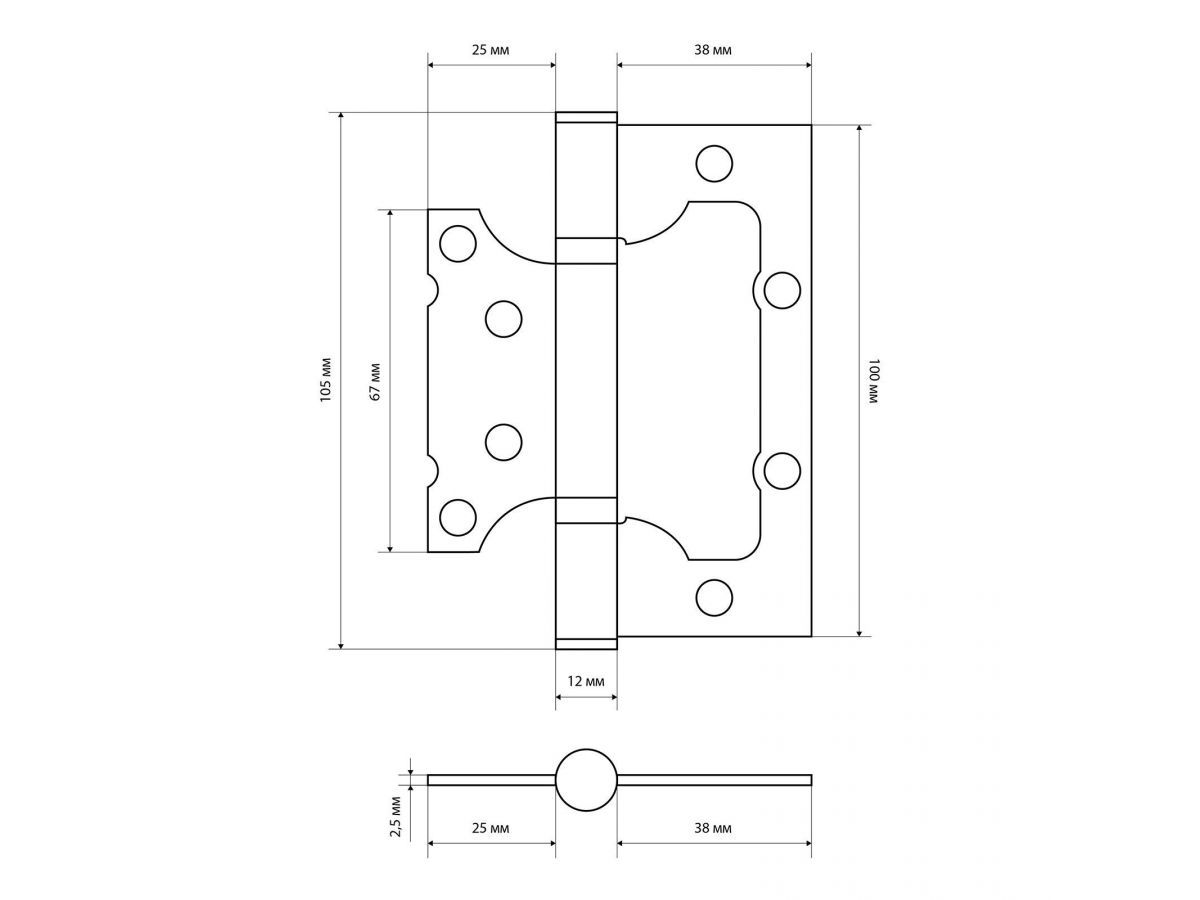 Петля дверная универсальная, без врезки. Предназначена для установки на левые и правые двери. Материал - сталь, гальваническое покрытие. Размер петли - 100х75х2,5 мм. 2 противоскрипных кольца, плоский колпачок.